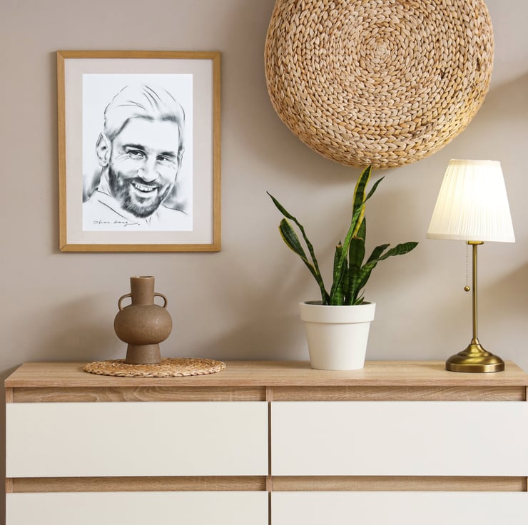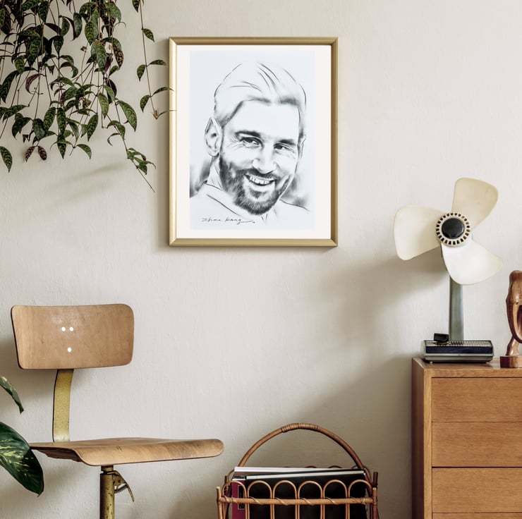 The portrait is displayed in a black frame and displayed in other room settings for reference only. A frame is NOT supplied and the drawing is rolled up and dispatched in a postal tube.