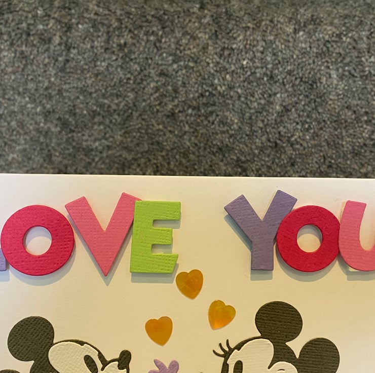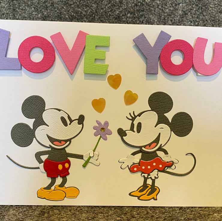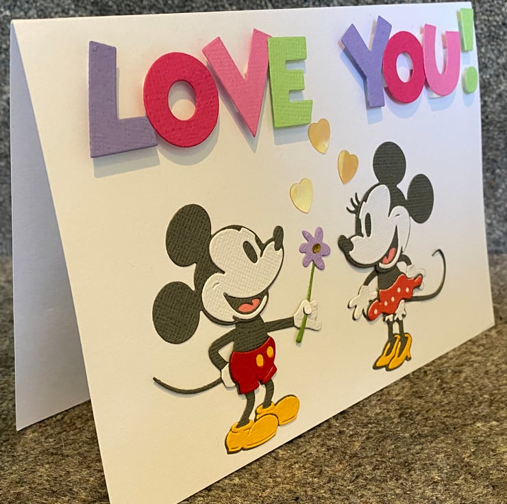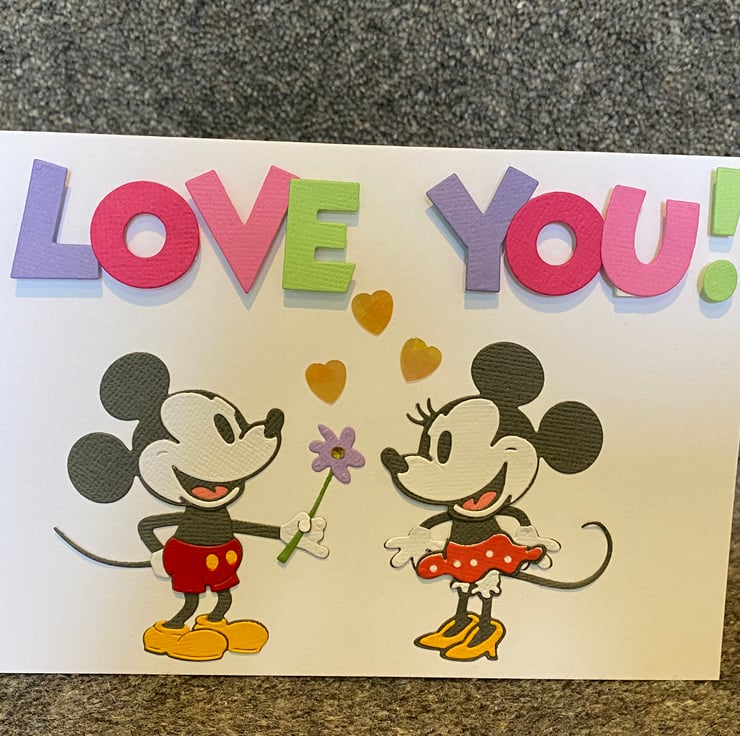 Celebrate love with a touch of Disney magic! This charming handmade Valentine’s card features the iconic duo Mickey and Minnie Mouse in a sweet romantic moment. Mickey presents Minnie with a purple flower beneath bold, colourful 3D-style lettering that reads “LOVE YOU!”, accented by three golden hearts. Perfect for Valentine’s Day, anniversaries, or simply to say “I love you” in a playful, heartfelt way.