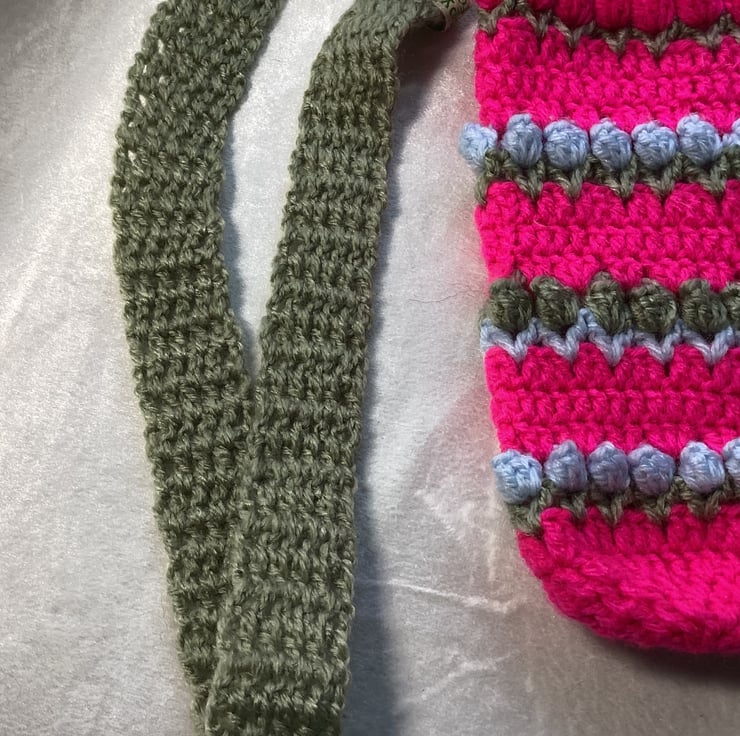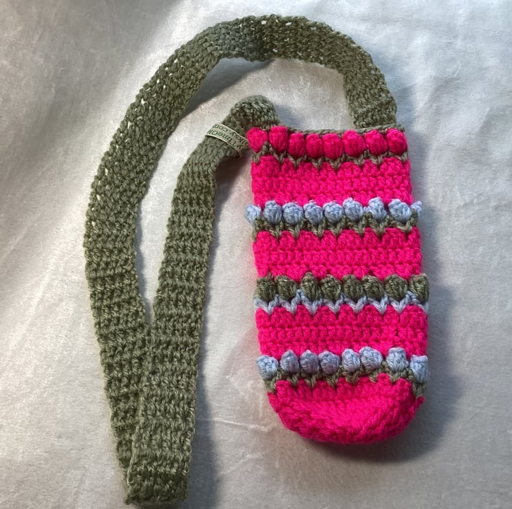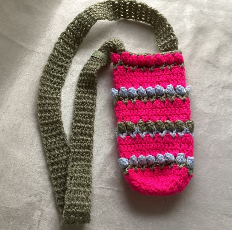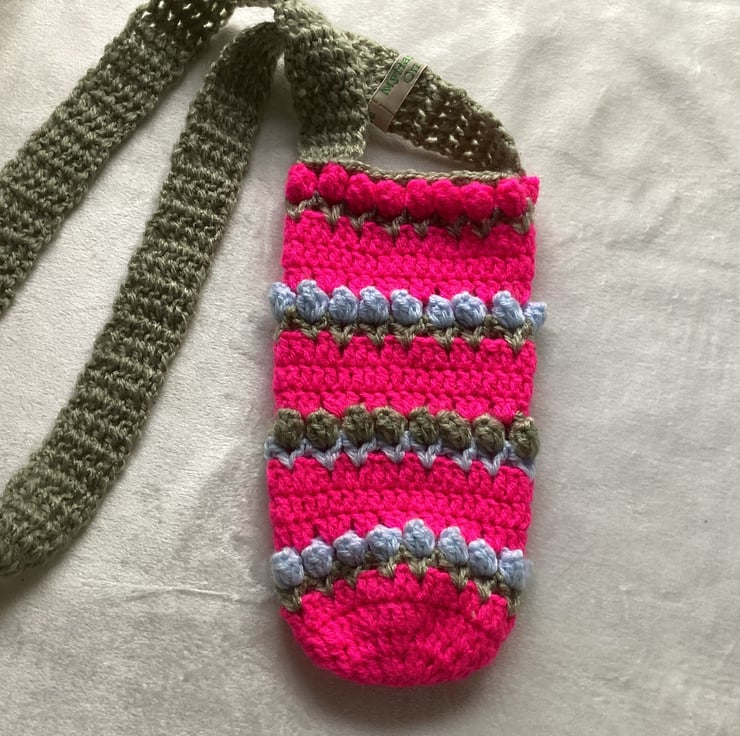 Handmade , crochet by me in my home studio in West Midlands. Perfect for when you go for a walk and save the hassle of carrying a bottle in your hands! You can carry it across the body as it has a long strong strap or tie the strap if you prefer it shorter. For this fun holder Ive used acrylic and cotton yarn. This is a perfect gift for any occasions. Please note: Colours may slightly vary due to the lighting during the photo shooting or the monitor's display. Bottles not included .