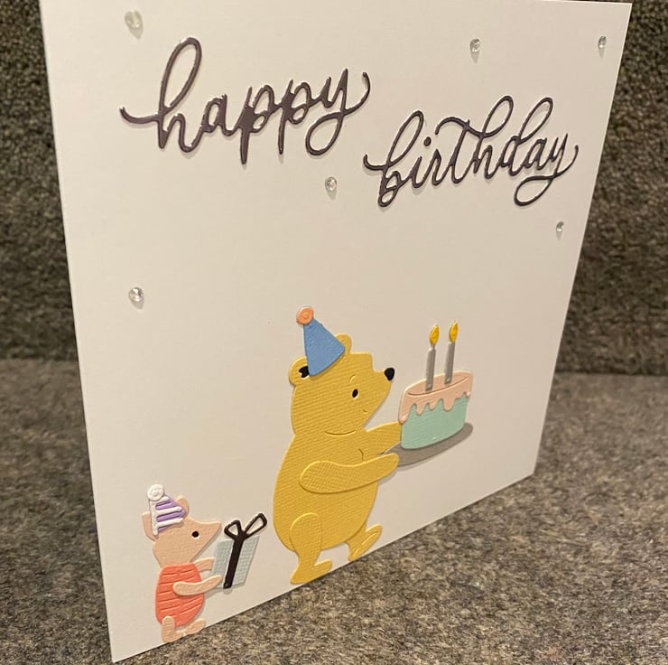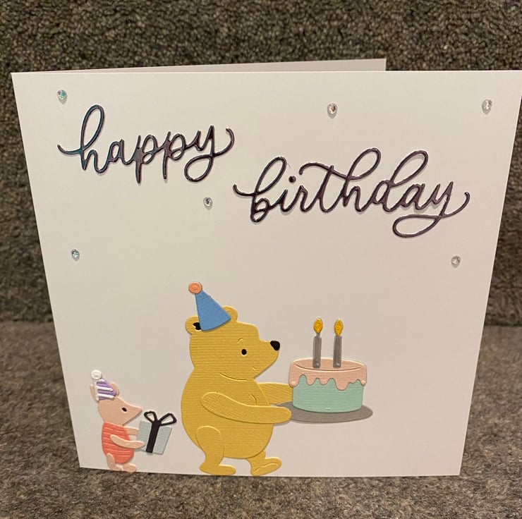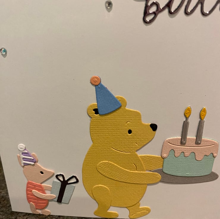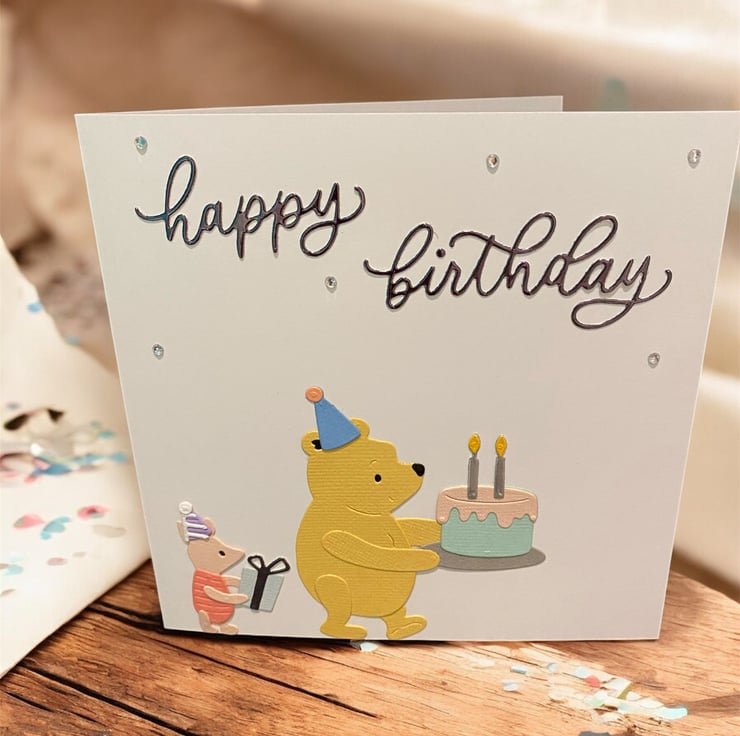 Celebrate a birthday with the timeless joy of friendship! This handmade card features beloved characters Pooh Bear and Piglet in a sweet, festive scene. Pooh holds a birthday cake with glowing candles, while Piglet brings a wrapped gift, both dressed in cheerful party hats. Above them, elegant cursive lettering spells out “happy birthday,” surrounded by sparkly embellishments and playful confetti.