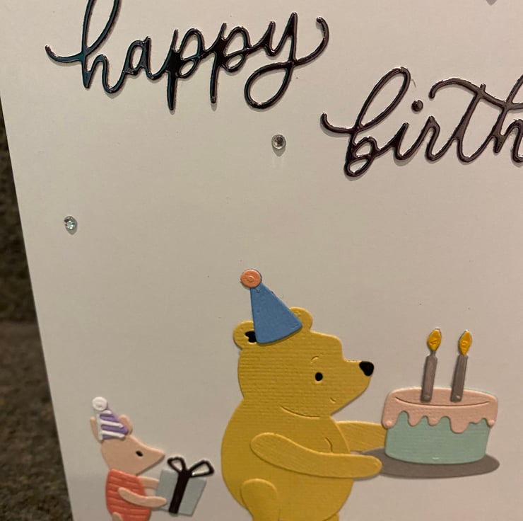 Front design: Pooh Bear and Piglet with cake and gift, “happy birthday” in cursive, sparkly accents