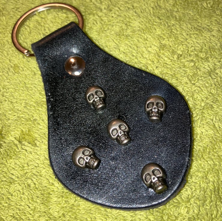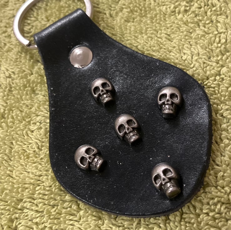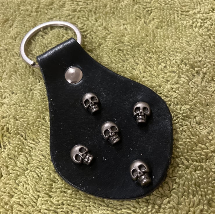 The 5 pewter coloured Skull Heads are riveted into the key fob.