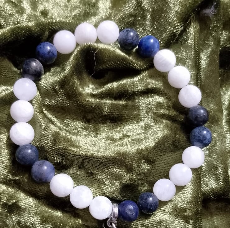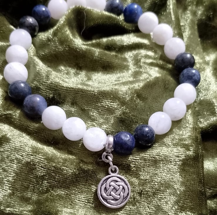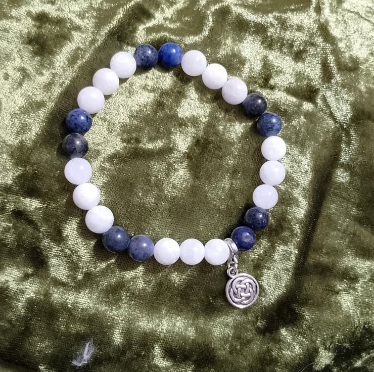 8mm beads to fit 17cm wrist with tibetan silver eternal knot. Dumortierite and Moonstone are popular gemstones often paired in jewellery blending Dumortierite's deep blue, patience-inducing calm with Moonstone's mystical intuition, creating pieces that offer grounding focus and intuitive boosts, with Dumortierite sometimes called "blue denim quartz" for its look and Moonstone known for its ethereal sheen. Dumortierite is a blue borosilicate mineral (often in quartz), while Moonstone is a variety of feldspar known for its adularescence (blue flash