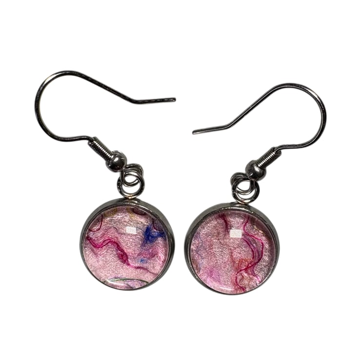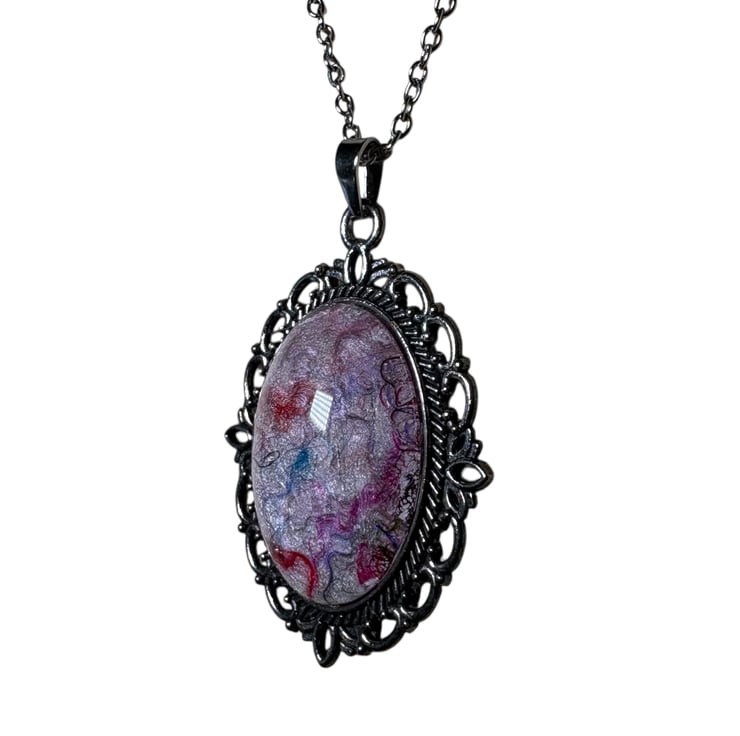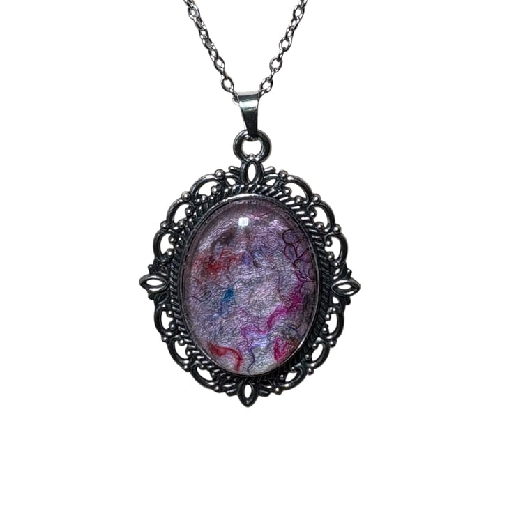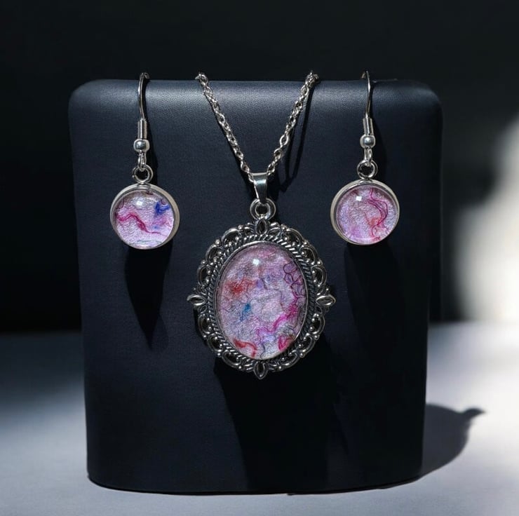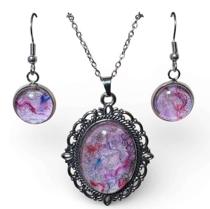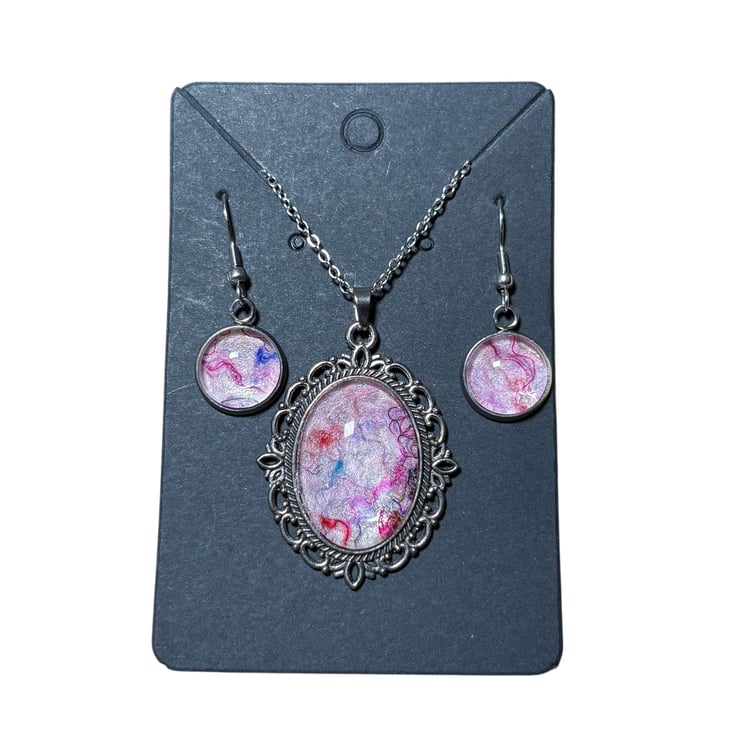 This beautiful, unique jewellery set consists of a vintage style oval pendant necklace and circular drop earrings, all made using a piece of handmade pale pink felt embellished with multicoloured silk fibres mounted under a glass cabochon.