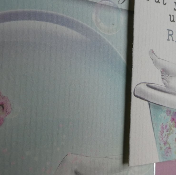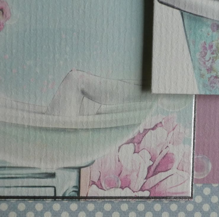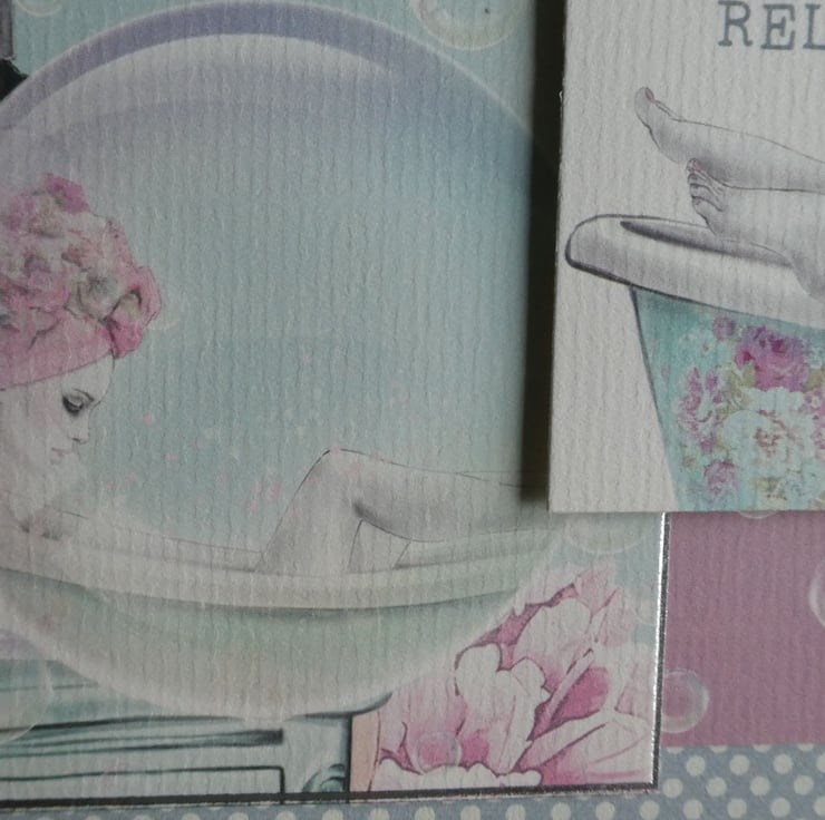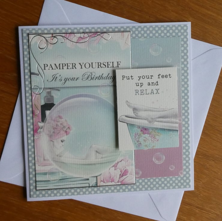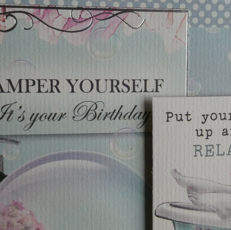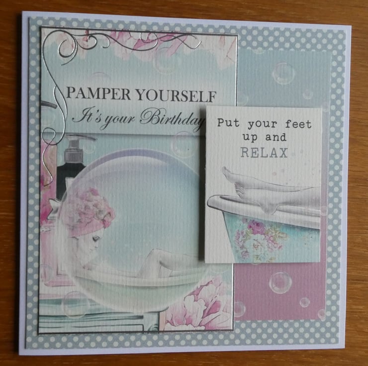 The main focal image of a lady relaxing in the bath, surrounded by bubbles and toiletries has been mounted onto layers of co-ordinating card with a soft pink and blue bubble patterened card over a cream and soft grey/green dotty background. The image also has the words Pamper Yourself It's your Birthday printed towards the top.