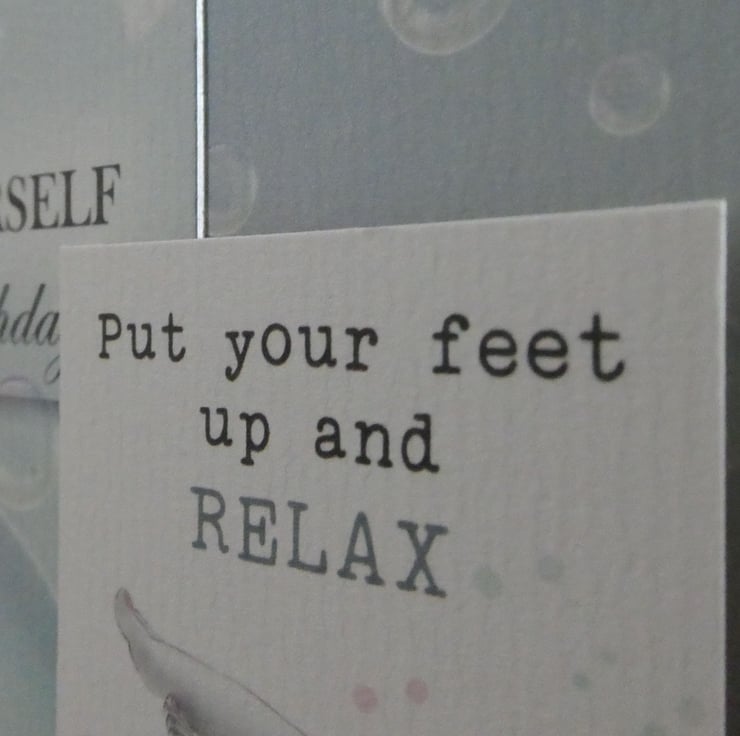 A further, smaller image of feet relaxing on the edge of a floral roll top bath has been added on the right hand side. This has the message 'Put your feet up and relax' and has been raised on foam pads to add dimension.