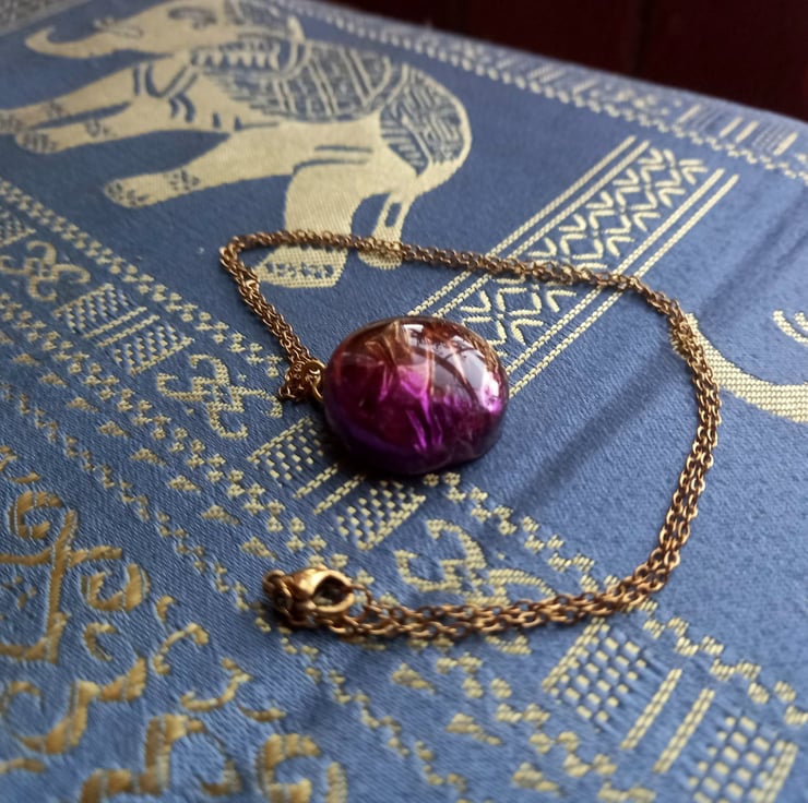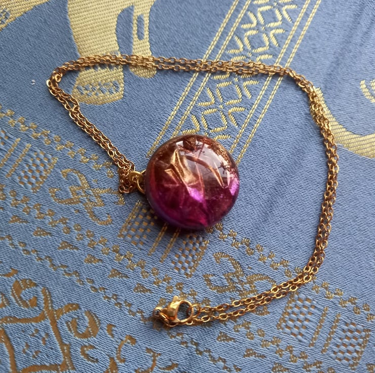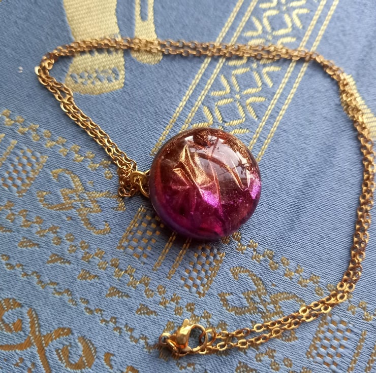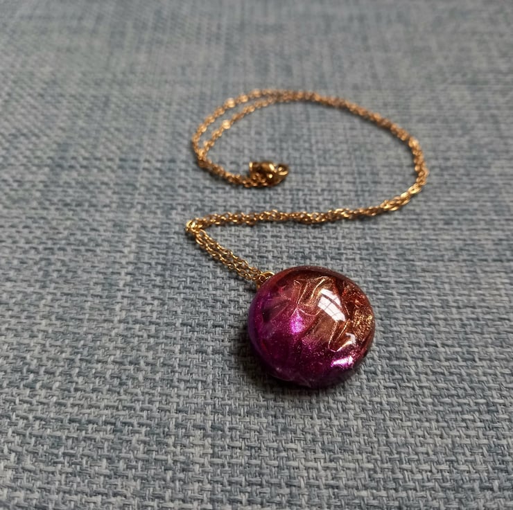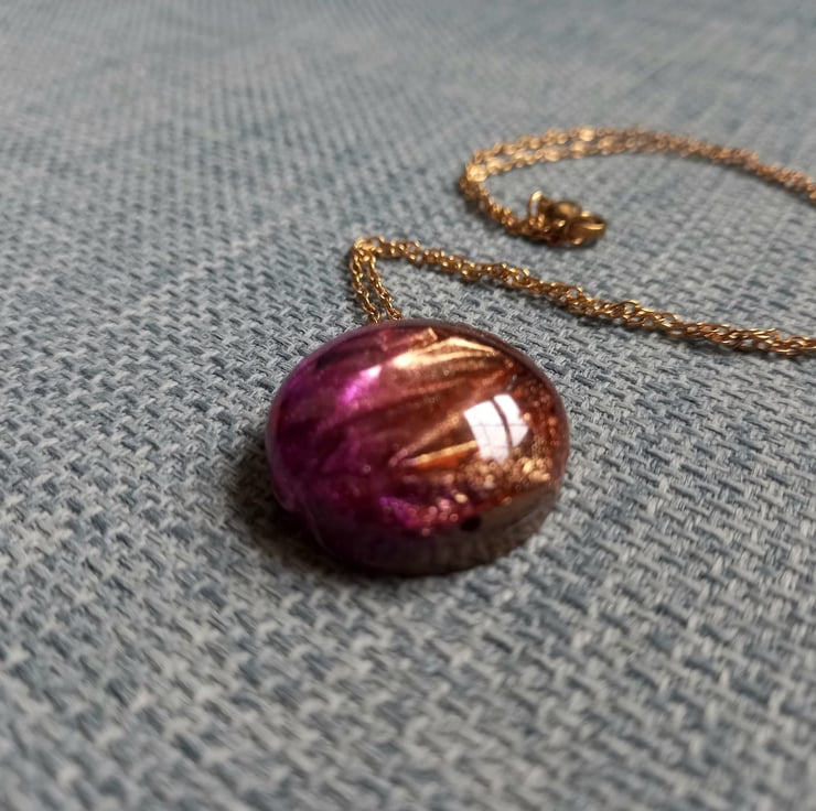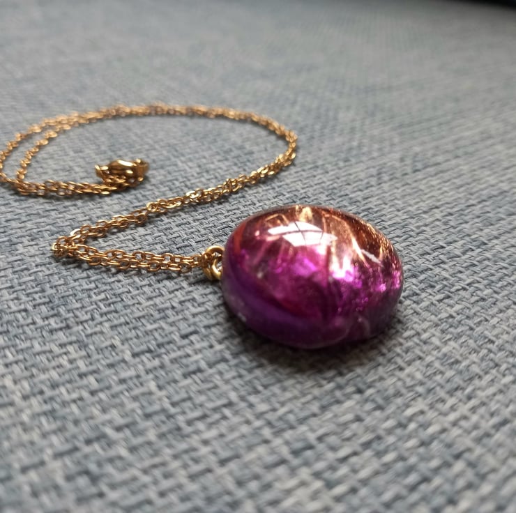 These necklaces have been handmade with a combination of UV and Epoxy resin. The crinkle effect was created with cling film and a selection of purple and gold mica powders. They are then attached to a copper wire and chain.