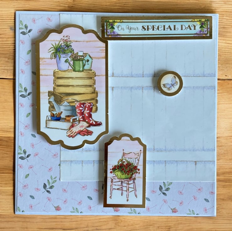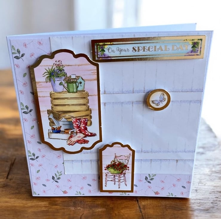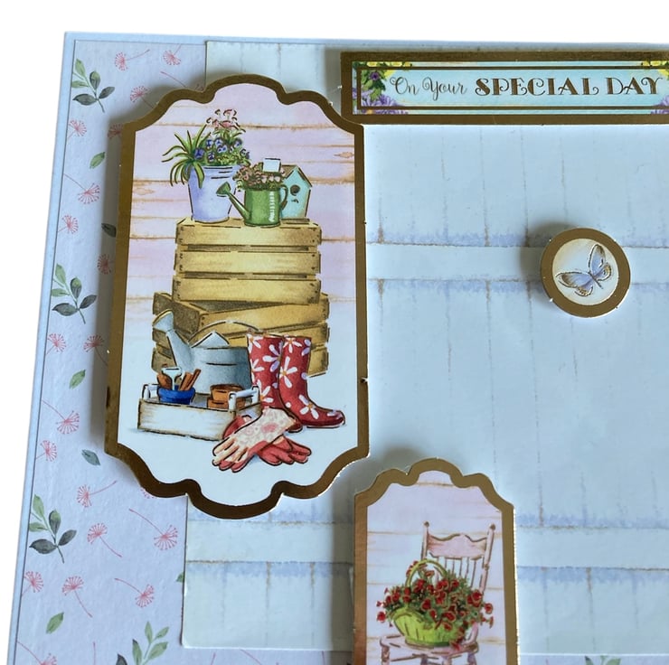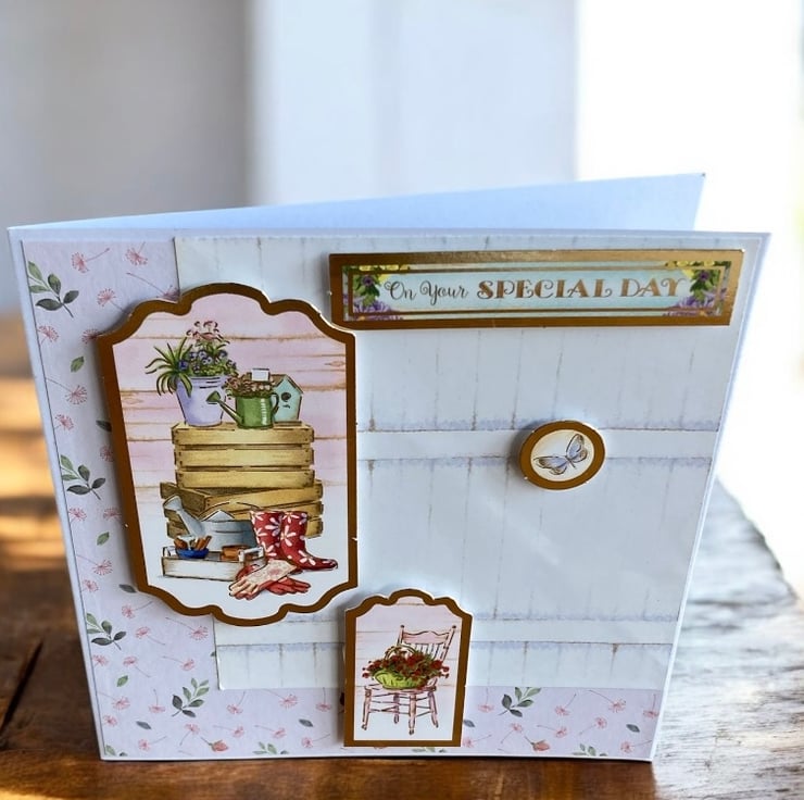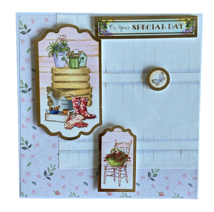 Soft pastel tones, rustic gardening illustrations, and elegant gold accents give this card a timeless cottage-core feel. The front sentiment reads ‘On Your Special Day’, making it perfect for birthdays, celebrations, or heartfelt occasions.