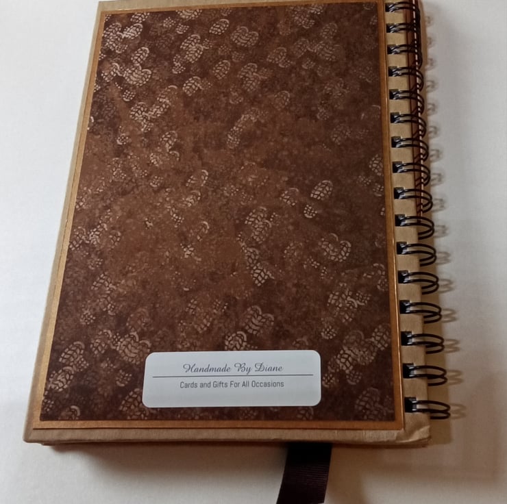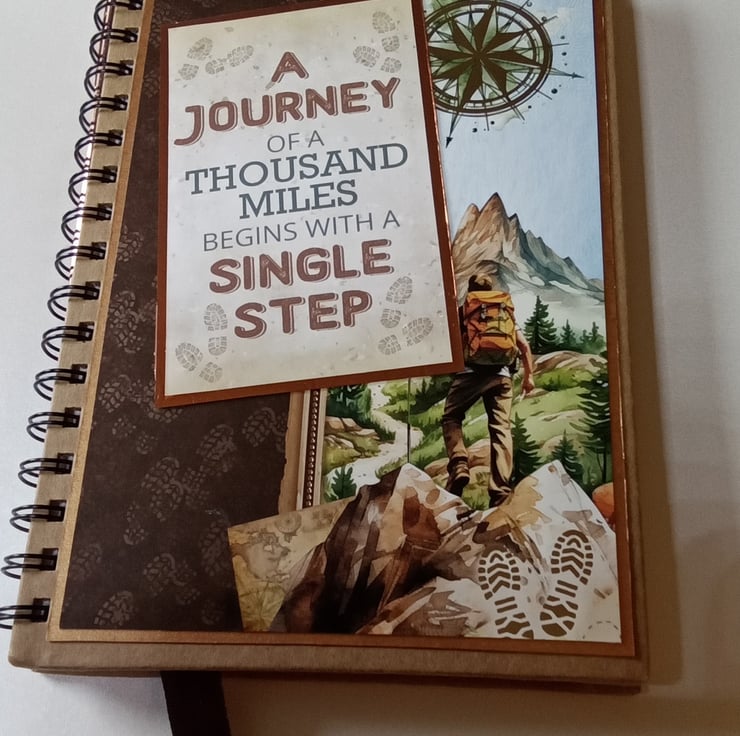 The base book has a hardback cover and is spiral bound (which makes it easier to lie flat when opened) I have decorated it with an image of a hiker climbing a mountain and added a smaller motto with the words "A Journey Of A Thousand Miles Begins With A Single Step"
