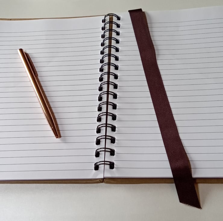 I have added a useful pocket to the inside of the front cover which is a good size for tickets, business cards etc. I have also added a ribbon bookmark, there is a ballpoint pen included and a spare refill for the pen is in the inside pocket.