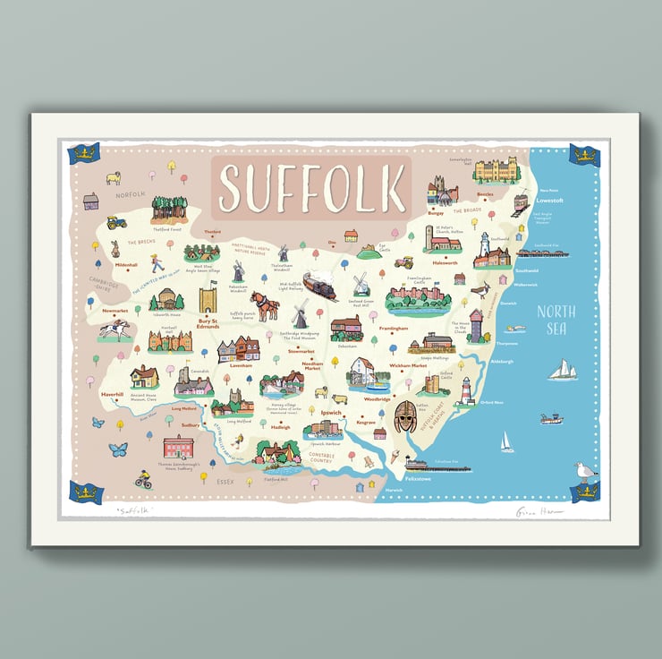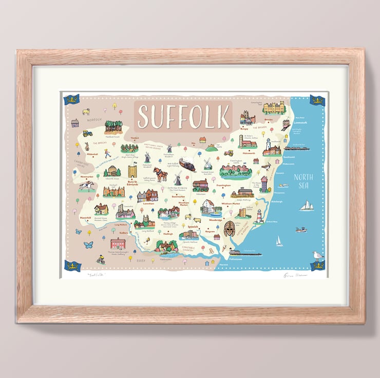 Beautiful illustrated A2 wall map of the English county of Suffolk.