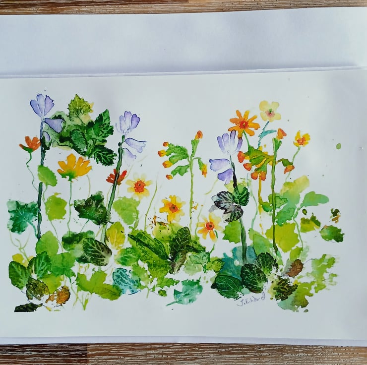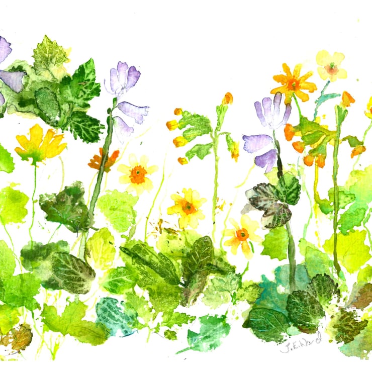A Beautiful Print card originally painted in Watercolours Cowslips, Primroses and Bluebells. A perfect Mother's day or Easter card.