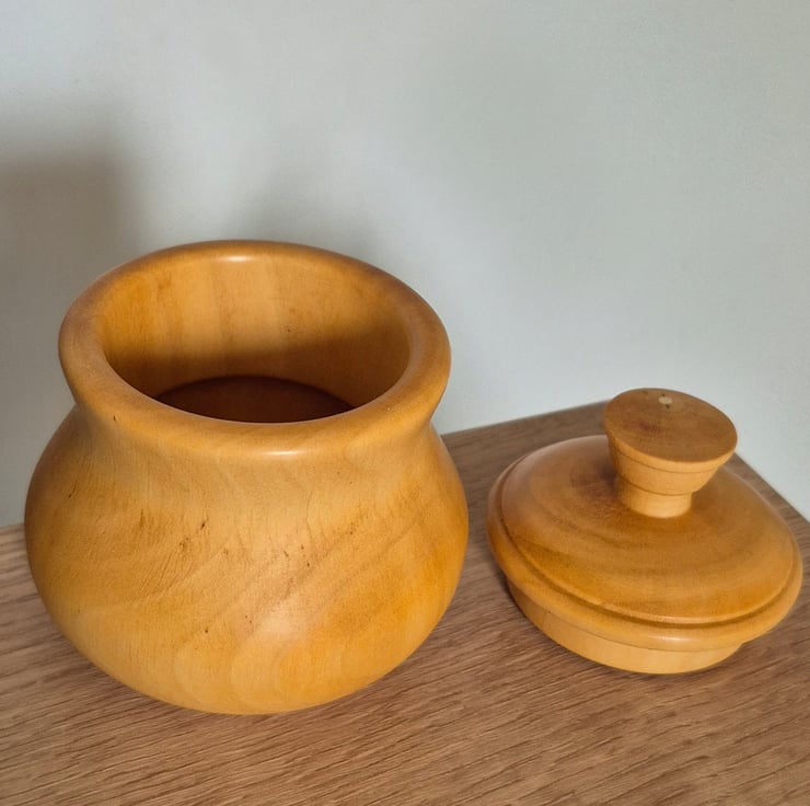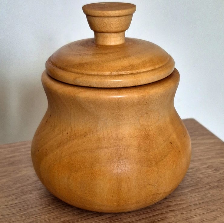 This small handcrafted trinket pot is turned from Maple wood and stands just under 4 inches tall. Maple is known for its smooth texture and soft, warm colouring, which gives this piece a clean and timeless look. Finished with a well-fitting lid and gentle curves, it’s ideal for storing jewellery, keepsakes, coins, or other small treasures. Each pot is individually made, ensuring subtle variations that make every piece unique.