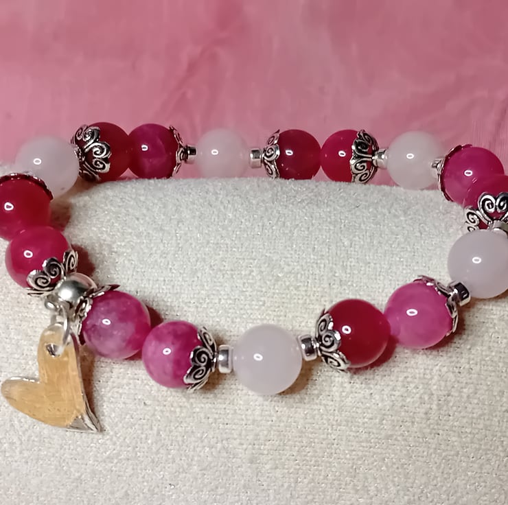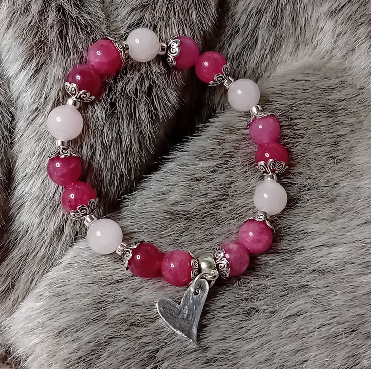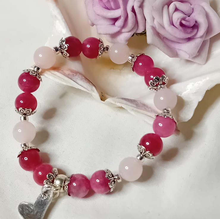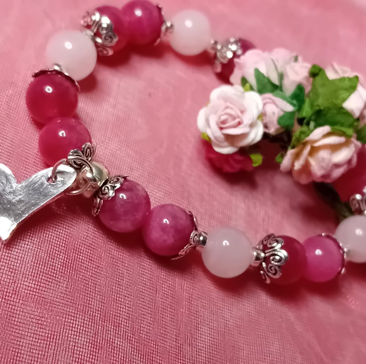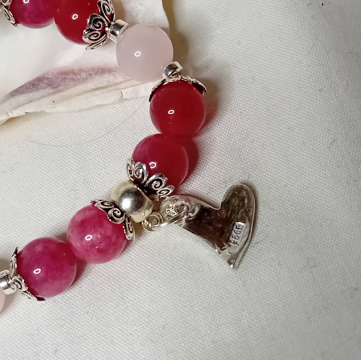 This exquisite bracelet features 8mm Rose Quartz and Strawberry Quartz beads, beautifully complemented by Silver Hematite accents and a handcrafted Sterling Silver (stamped) Heart Charm.
