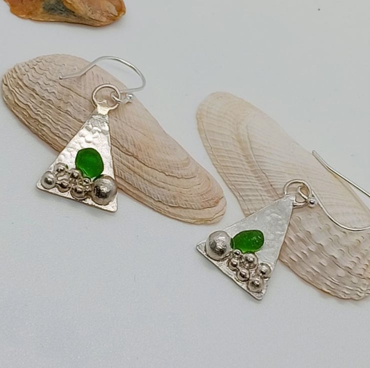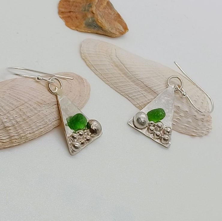 Silver pebbles and green seaham seaglass triangle earrings, its like finding seaglass amongst the pebbles at the beach.