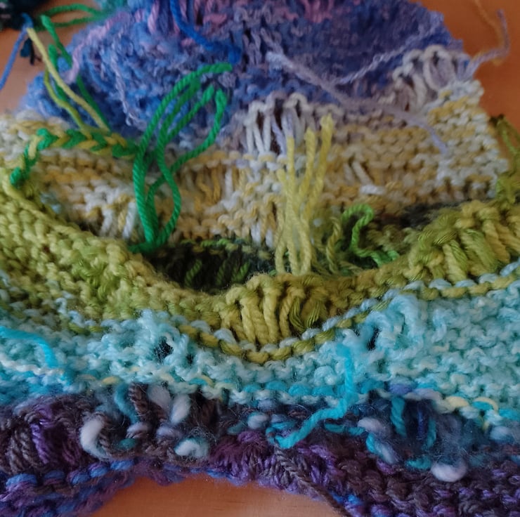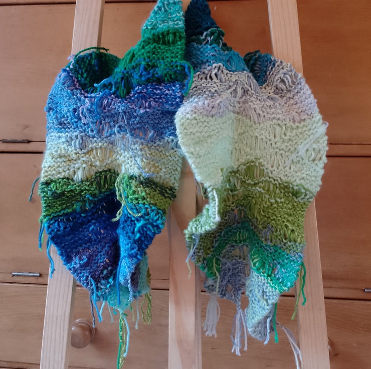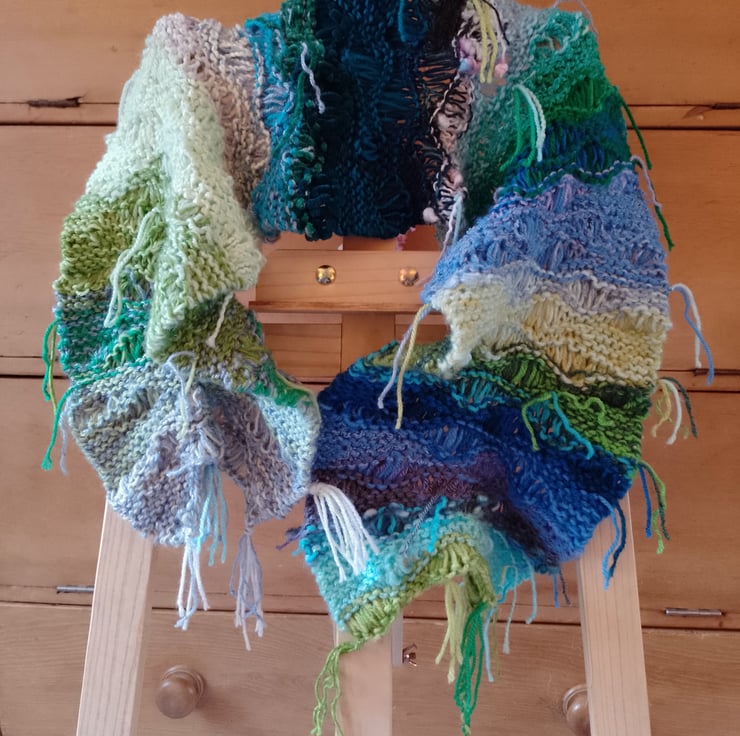 Inspired by the thoughts of faraway oceans and their colours, this short scarf / neck warmer is made from a mixture of yarn types and textures.