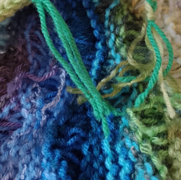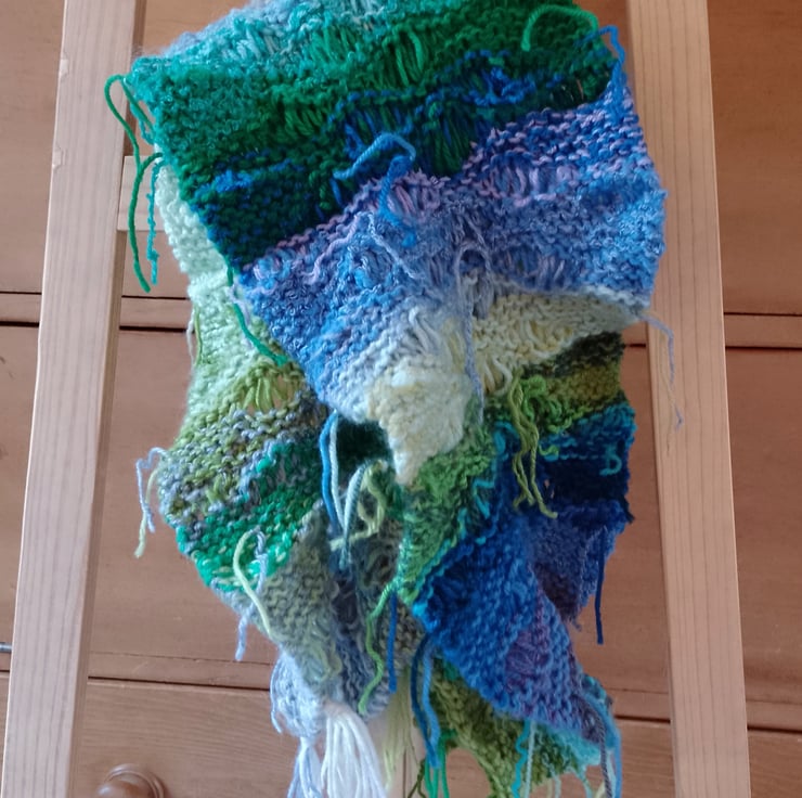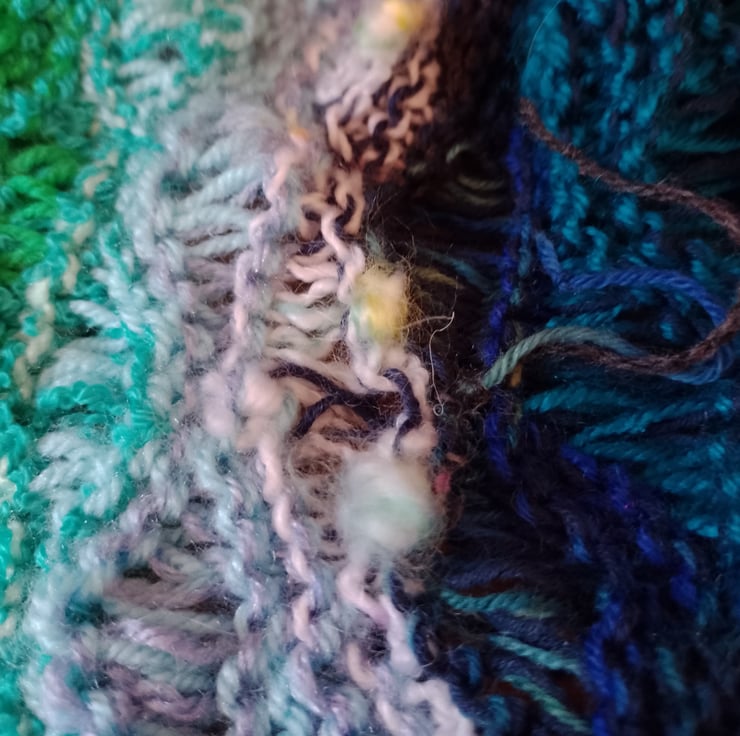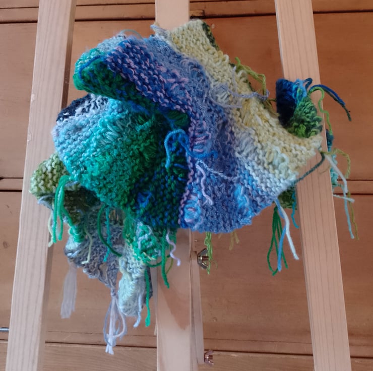 Knitted using short rows and a wavy drop stitch pattern that mimic the changing, rhythmical movements of water, there is also fluffy white texture to resemble sea foam and yarn ends have purposefully been left on show (but secured) to commit up images of seaweed.
