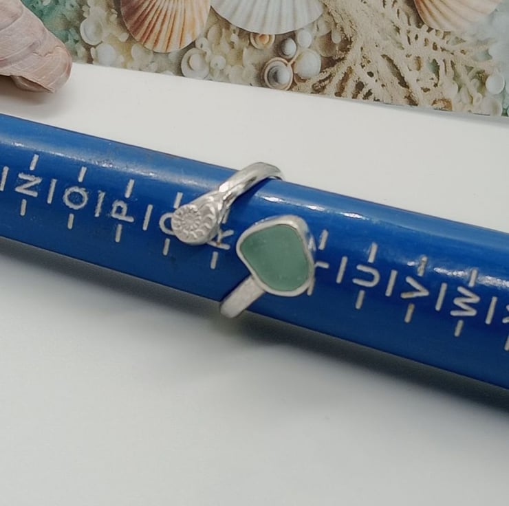 The ring size is a size S, the sea glass is 1 cm x 1.1 cm, the ammonite is 0.6 cm, the ring band is approximately 3.5 mm wide x 2 mm thick.