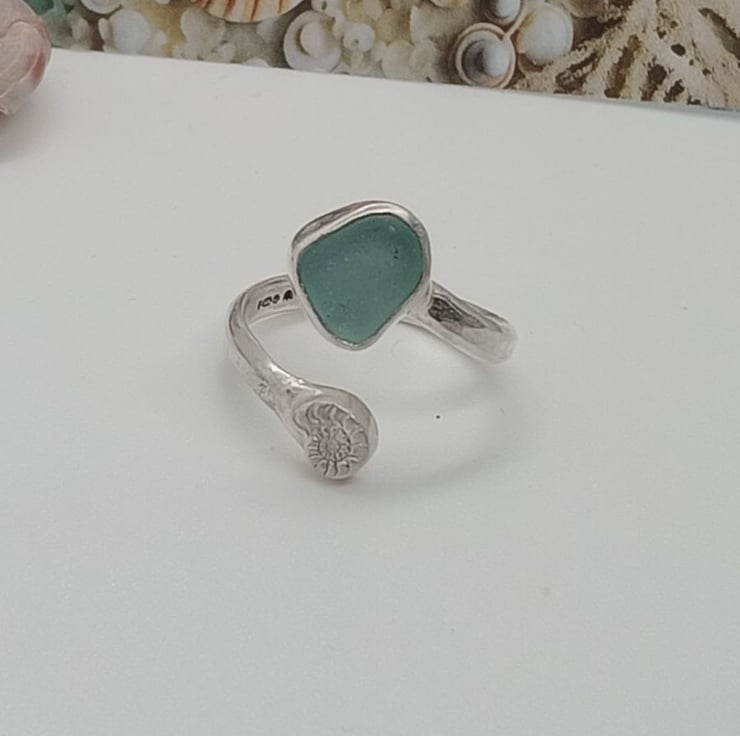 Aqua green sea glass wrap ring featuring a sterling silver Ammonite.