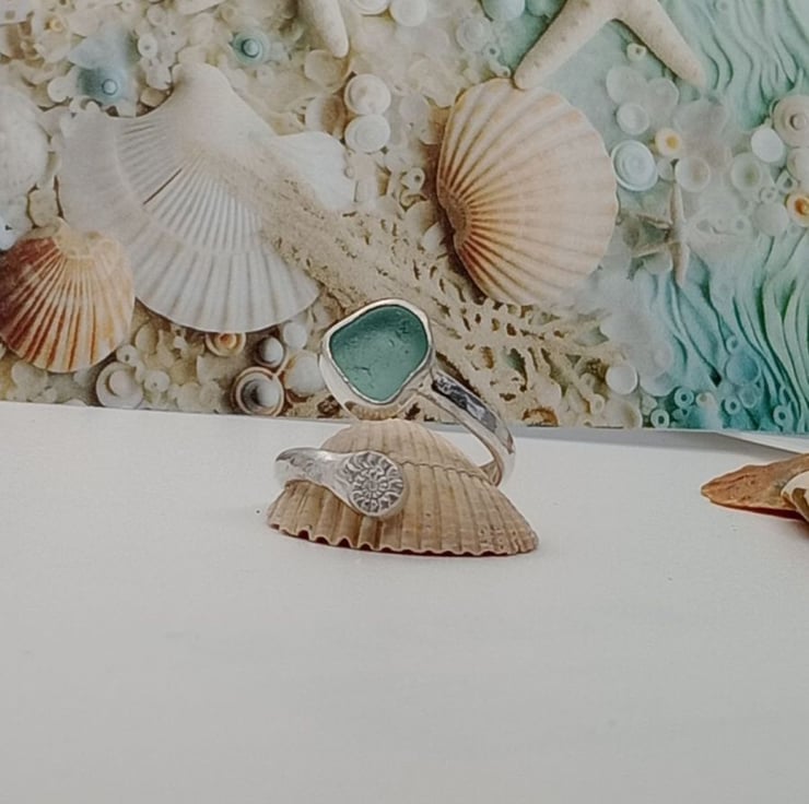 On one side of the oval lightly hammered ring band sits a fully backed rub over setting which encases the wonderful sea glass, at the opposite side of the band ring is a small sterling silver ammonite decoration.