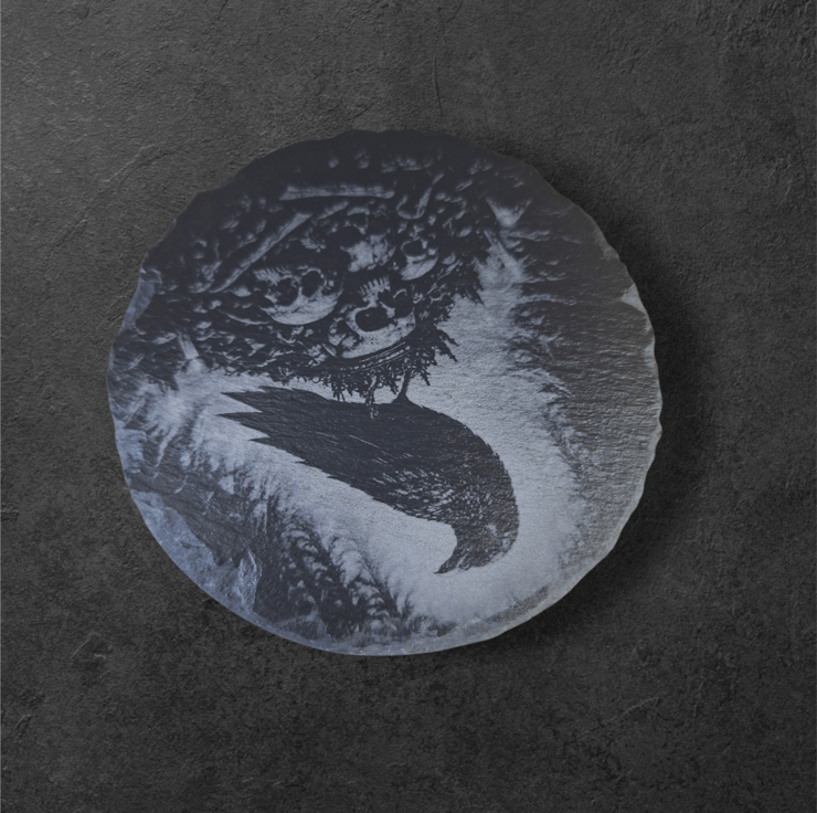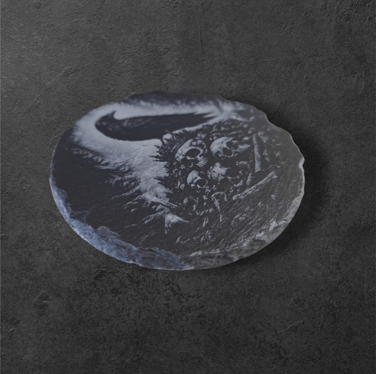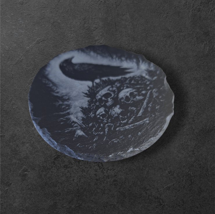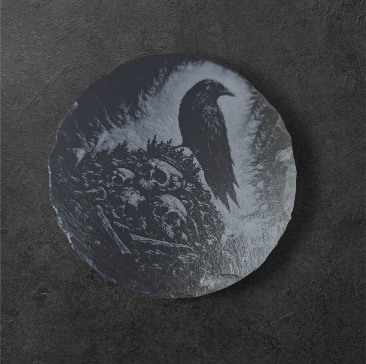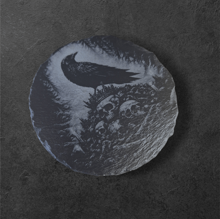This gothic raven slate coaster is a striking piece of dark, atmospheric art, combining the symbolism of the raven with a moody skull motif. Laser engraved onto natural slate, the design has a beautifully raw, tactile quality that celebrates the stone’s natural texture and uneven edges.