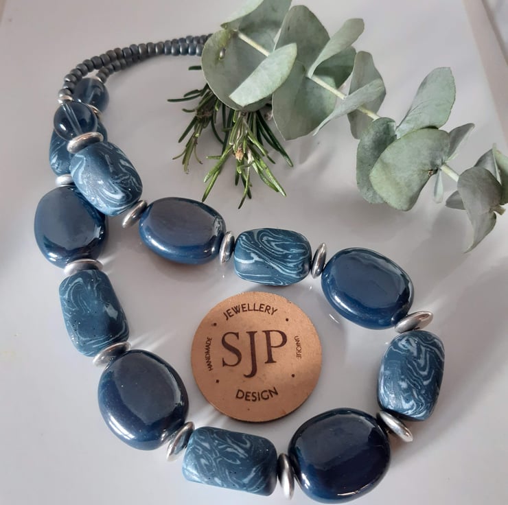 A handmade statement necklace featuring chunky polymer clay beads in a unique navy blue and silver swirl design, with a hint of sparkle. Each bead is individually crafted, giving the necklace a relaxed, artisanal feel.
