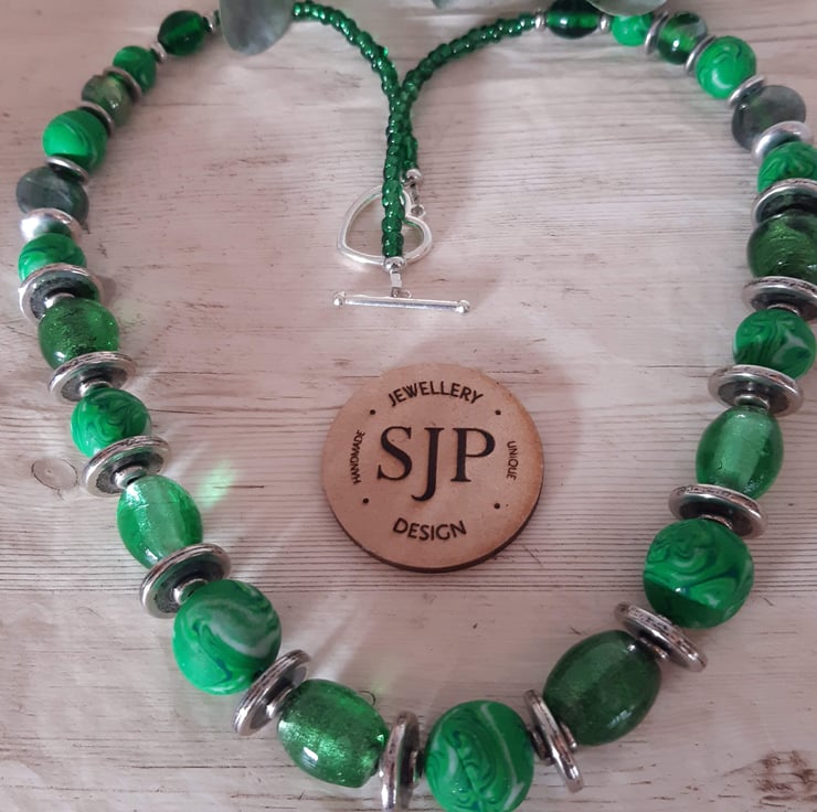 The round beads measure approximately 10mm to 17.3 mm and are accented with green glass beads. The glass beads include 16mm ovals, 12 mm 10.5mm glass rounds, ‘smartie’ type beads and 11mm green oval beads. 16mm silver plated rondelles and large green seed beads complete the design with subtle contrast and texture.