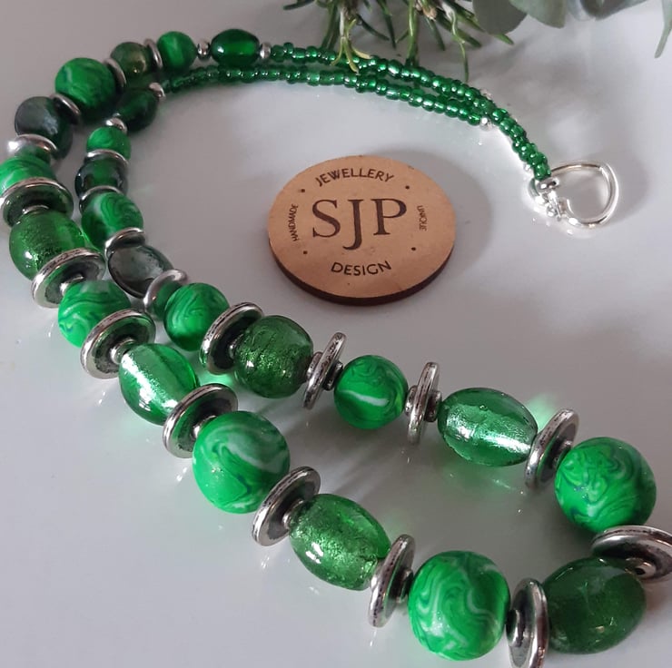 A vibrant handmade necklace featuring polymer clay beads in bright green, forest green, and silver, blended in a distinctive swirl design that perfectly complements the matching earrings.