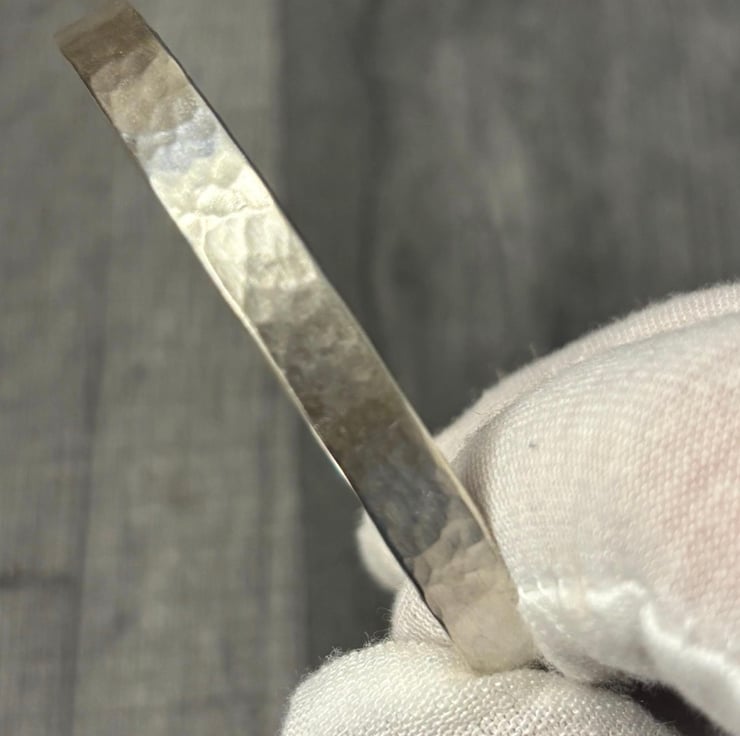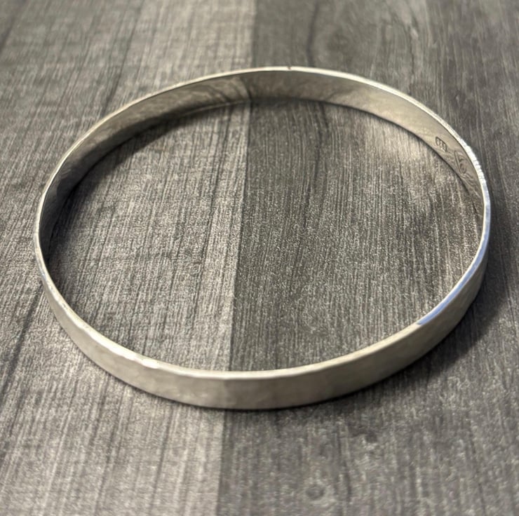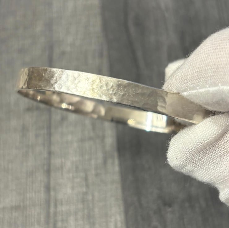 This Hammered Silver Bangle has been handcrafted by Michelle from solid Sterling Silver. The bangle has a satin finished, hammered effect and a shiny silver inside. If you would prefer the silver to be high polished rather than the matt satin finish, please let me know at Checkout or message me.