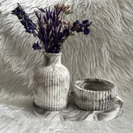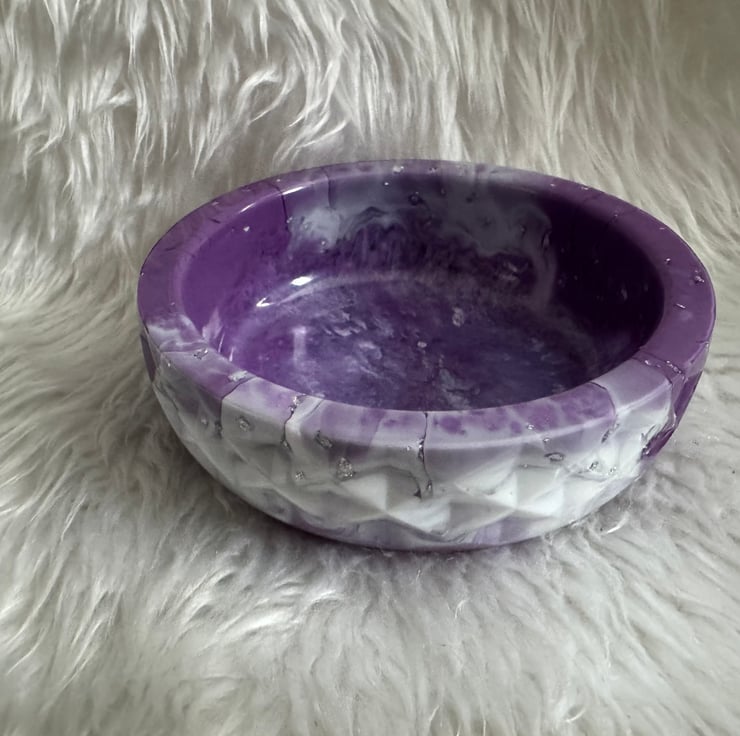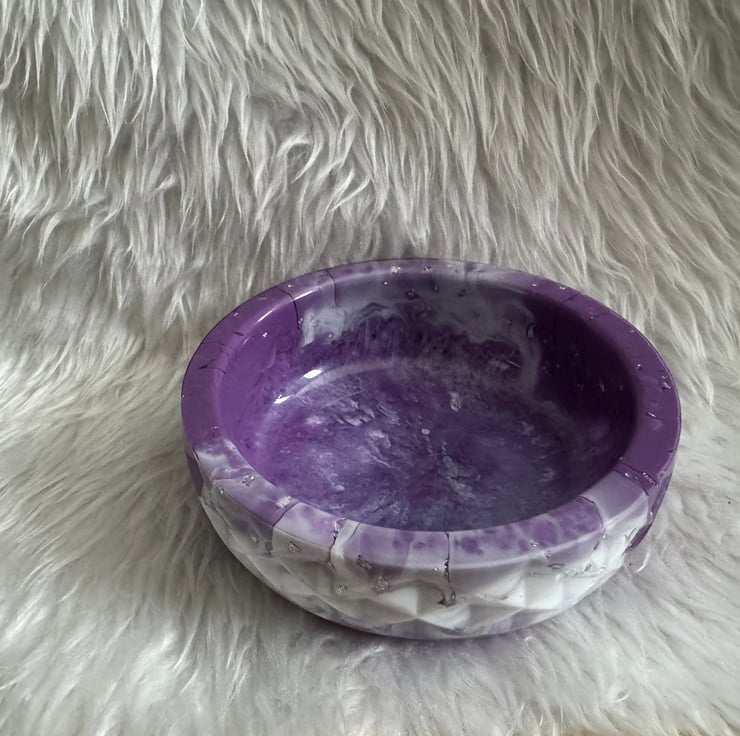 purple and white resin geometric bowl with silver flakes