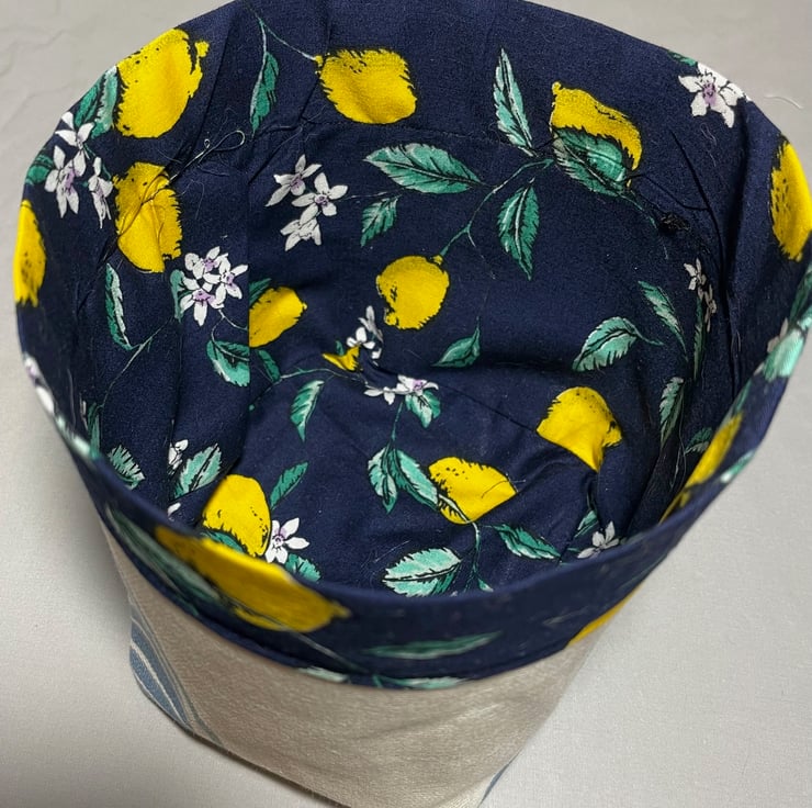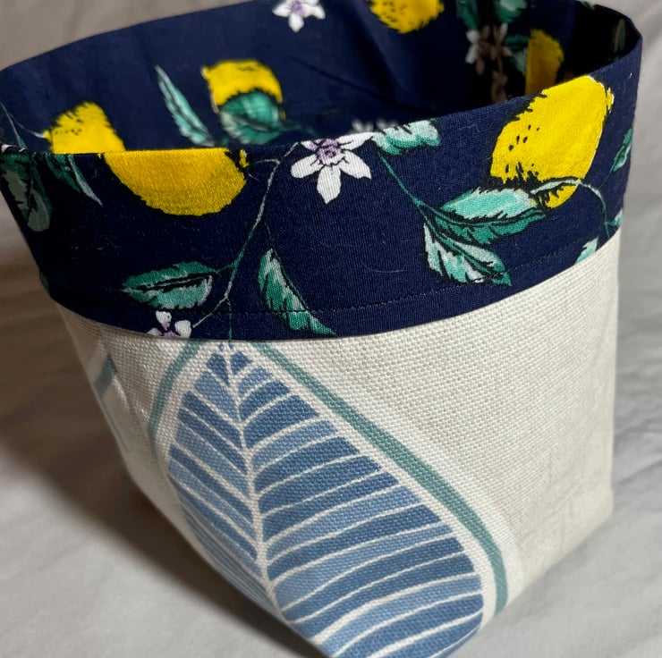 Handmade cotton fabric tub with contrasting lining, interfaced for extra strength and stability. You can fold the top over if you like that style, but because the lining extends over the outside, you don't have to - so you don't lose any storage capacity.