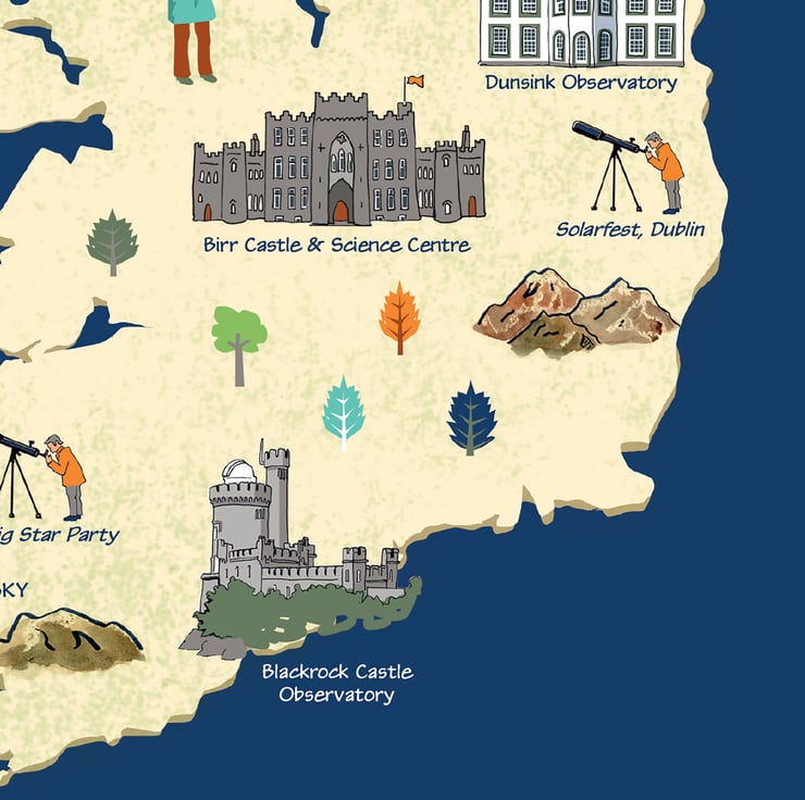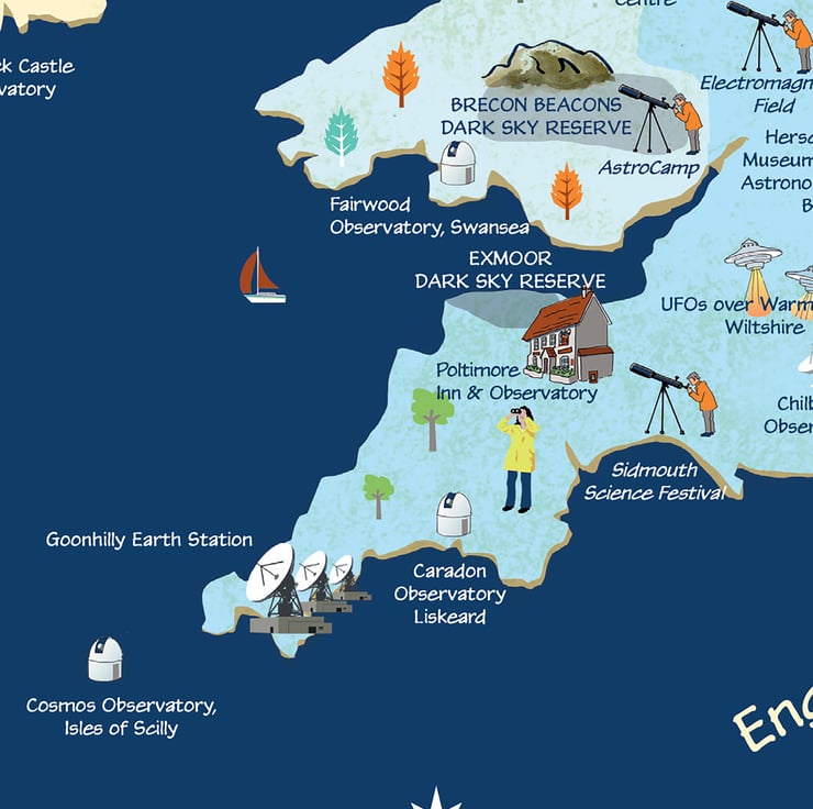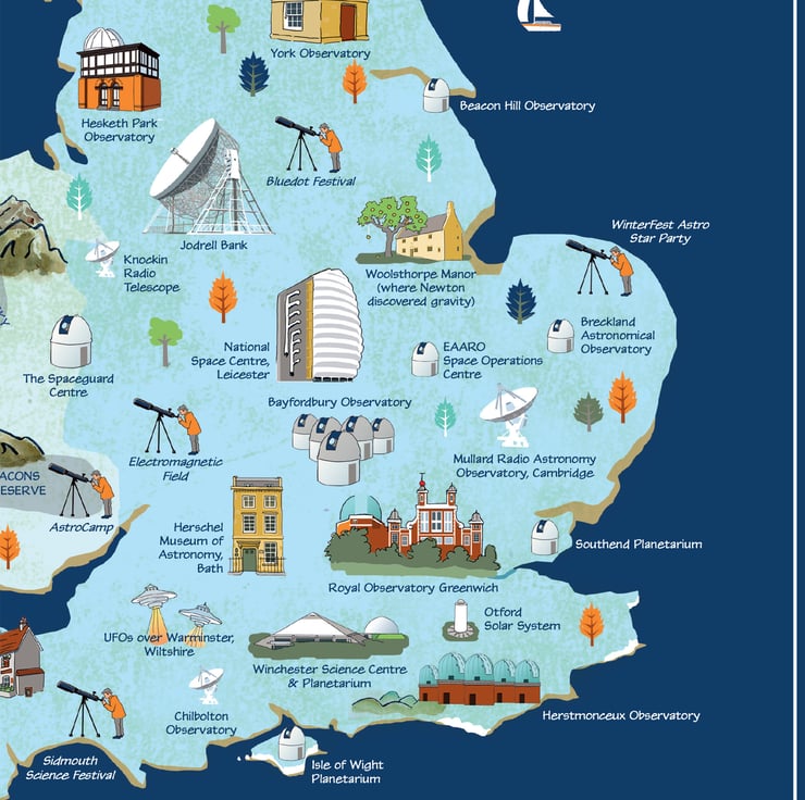I loved doing this map showing as many astronomy-themed British and Irish places as I could fit in. Lots of lovely observatories, some of them beautiful historic buildings and even castles. Plus several pubs that specialise in star-gazing, some dark sky parks, several planetariums and space museums, some annual astronomy events, Newton's house where he discovered gravity, and even the best place to spot flying saucers!