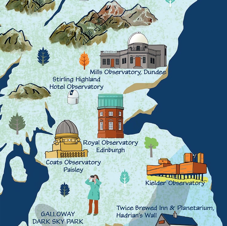 Beautiful illustrated map poster of showing many of the astronomy-related places of the British Isles.