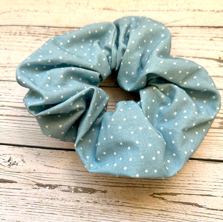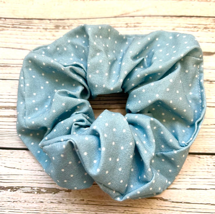Handmade scrunchie, pale blue with white polka dot pattern. Made with 100% cotton fabric.