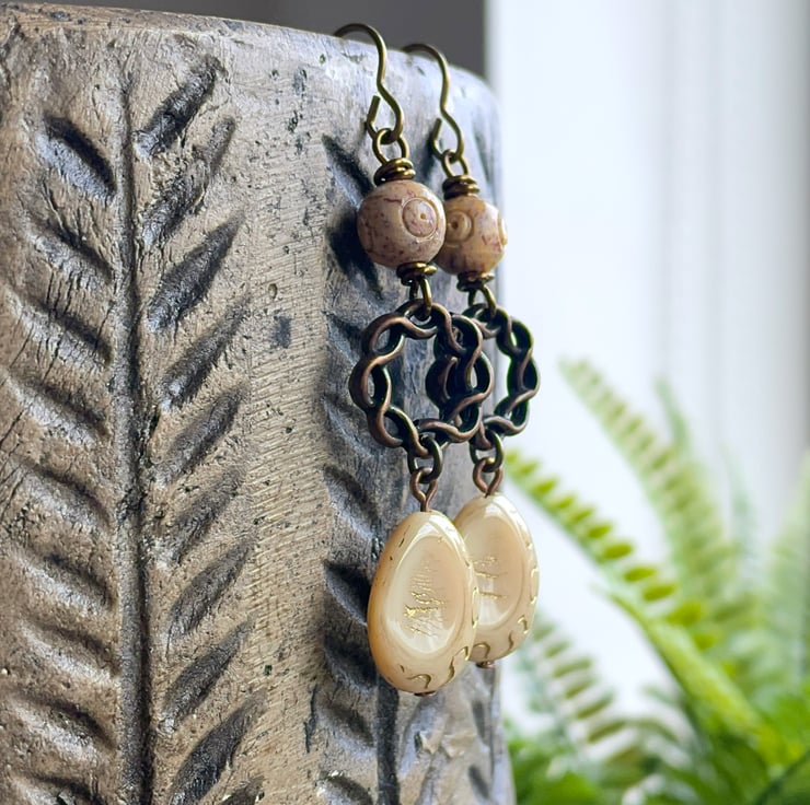 Lightweight and comfortable for everyday wear, the earrings are finished with small Vintaj brass French hook earwires. They measure approximately 5 1/2 cm from the base of the earwire, with a total drop of around 6 1/2 cm.
