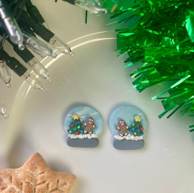 Intricate Details: Each earring features a hand-sculpted scene inside the globe—a cheerful gingerbread man standing next to colourful Christmas trees, set against a beautiful marbled blue sky and grey snow base.