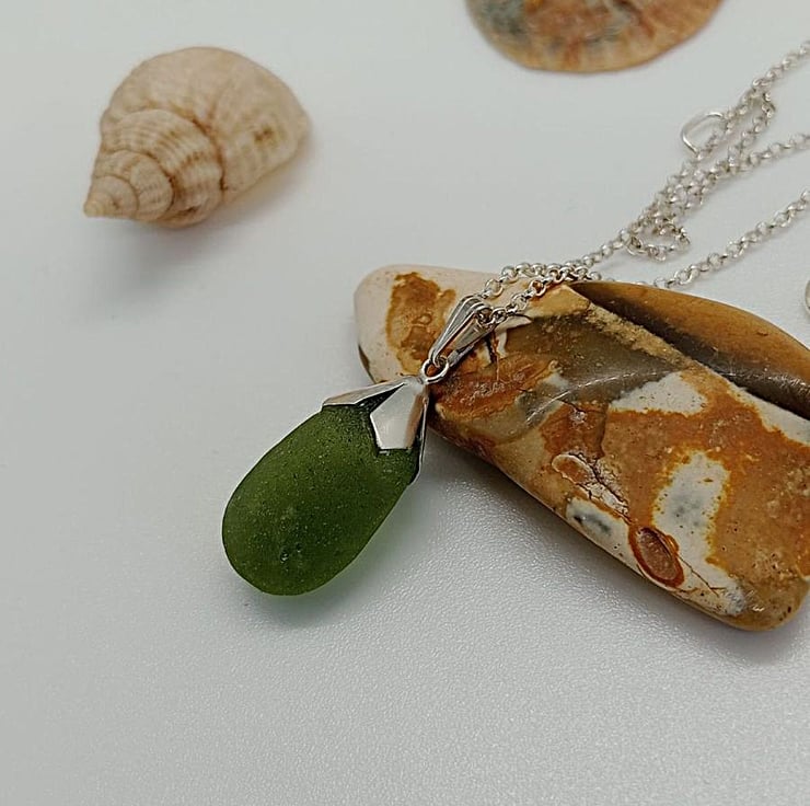 Olive green seaham seaglass Naturally tumbled by seaham sea is set in a sterling silver bell cap with bail suspended from an 18 inch sterling silver chain.
