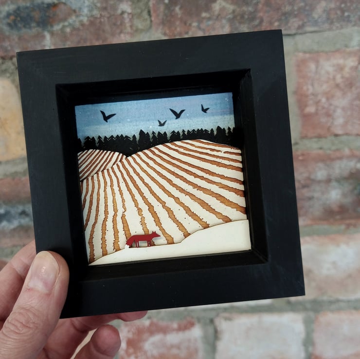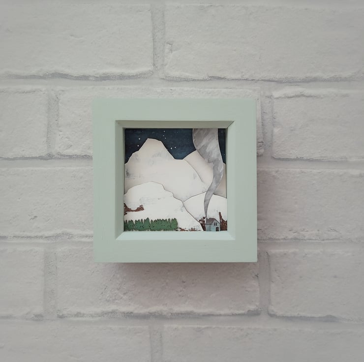 The design comes from original drawings which have been transformed into layers of laser cut wood, painted by hand and built up to form 3d layers set into a sage green, glazed wooden box frame, which measures approx 11.5cm; the scene itself measures approx 7.8cm x 7.8cm x 1.5cm.