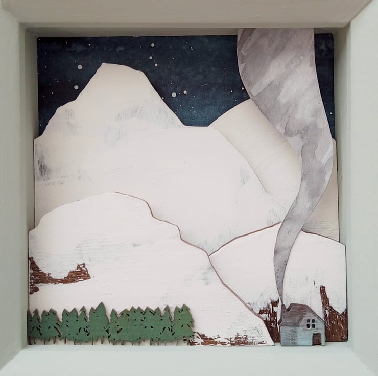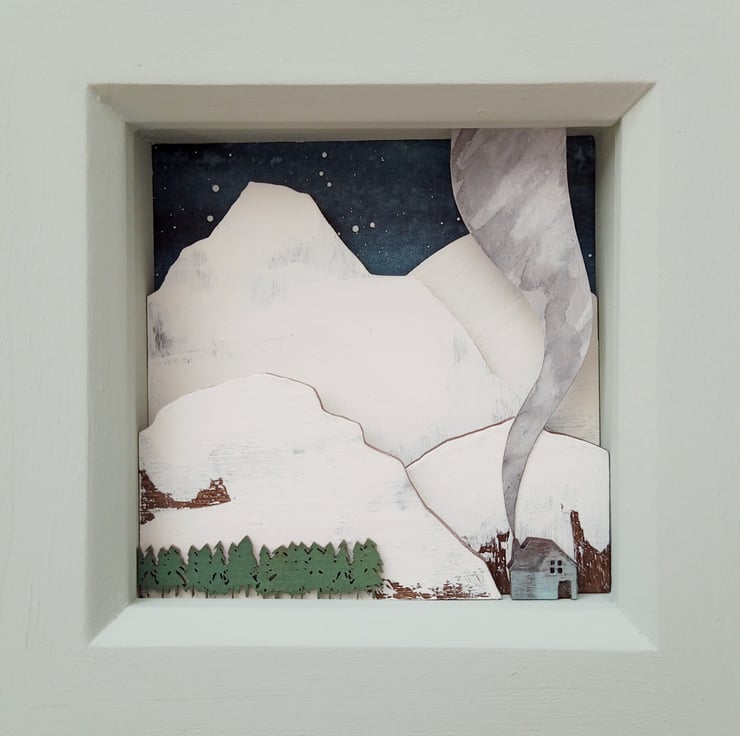 'Hushabye Mountain' - a little wooden cabin sits tucked away in the snowy mountains. This unique miniature scene is inspired by my love of the mountains of Scotland, and my life goal of having a cabin in the wilderness to escape to!