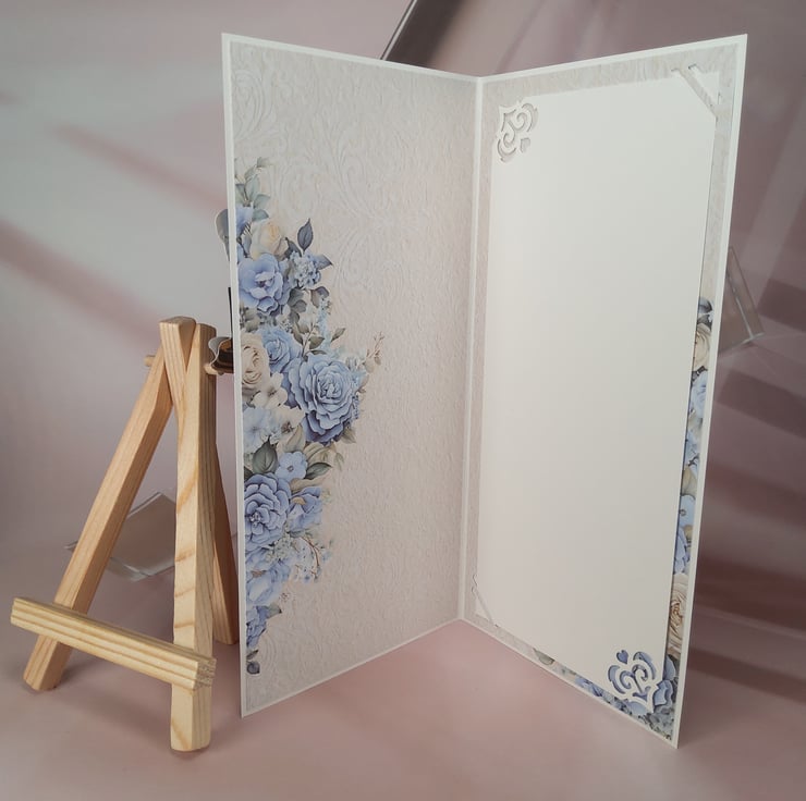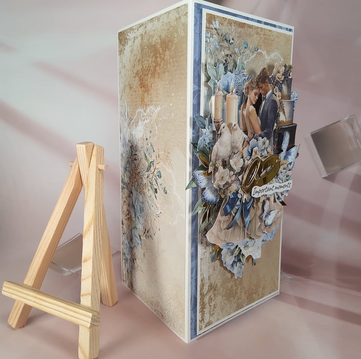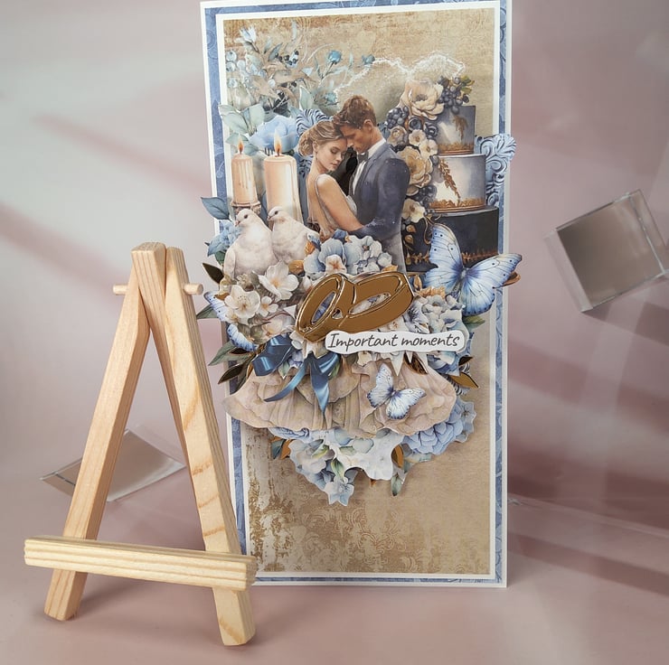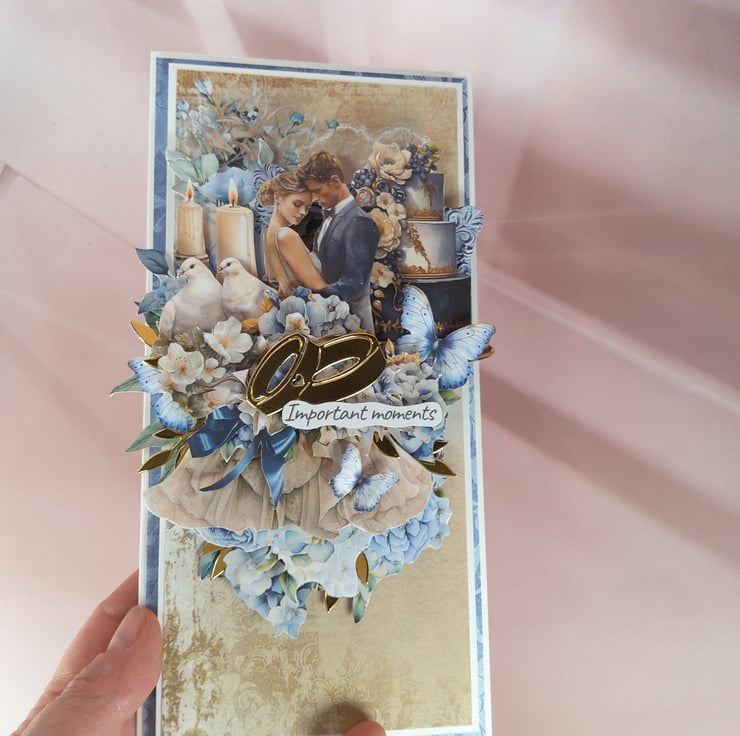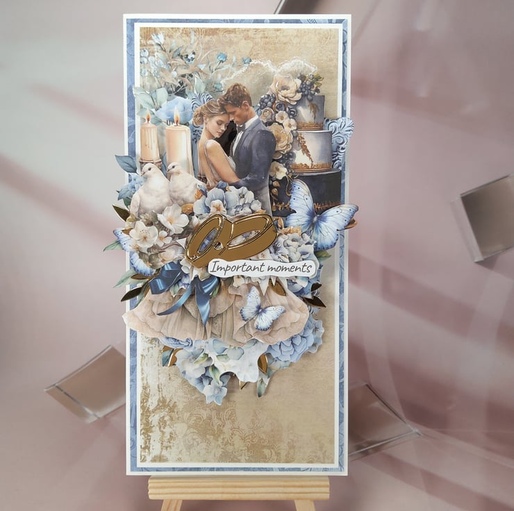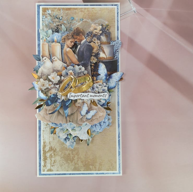 The design features a romantic couple, symbolic wedding rings, soft florals, doves, candles and delicate butterflies, all carefully layered to create depth and a luxurious finish. The muted blue and ivory tones add a calm, classic feel, making this card a meaningful keepsake.