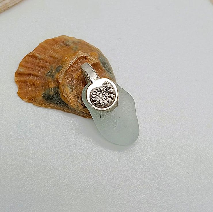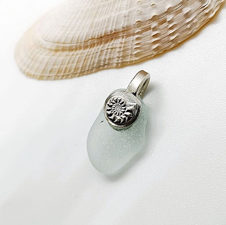 Natural sea tumbled seafoam green seaham sea glass pendant suspended from a solid sterling silver bail with Ammonite decoration.