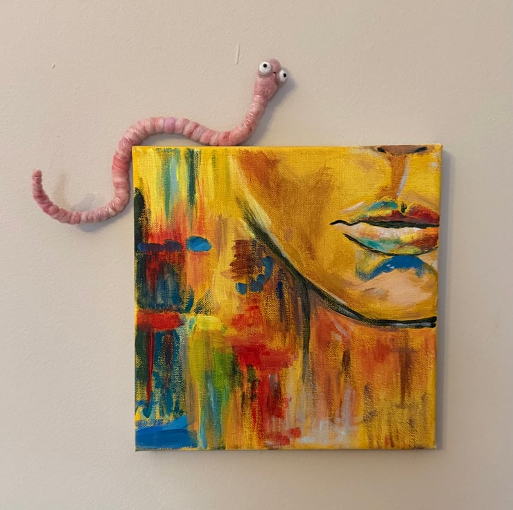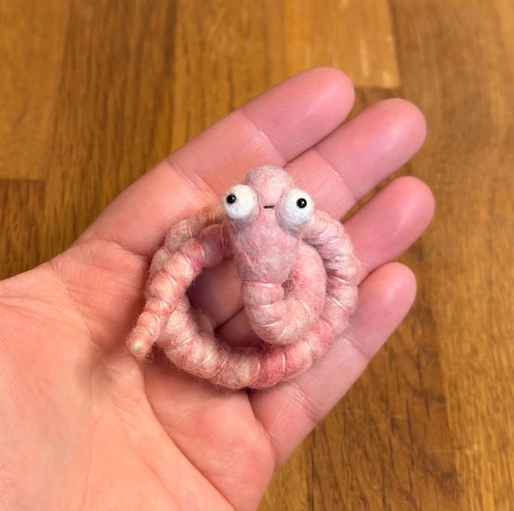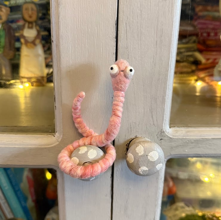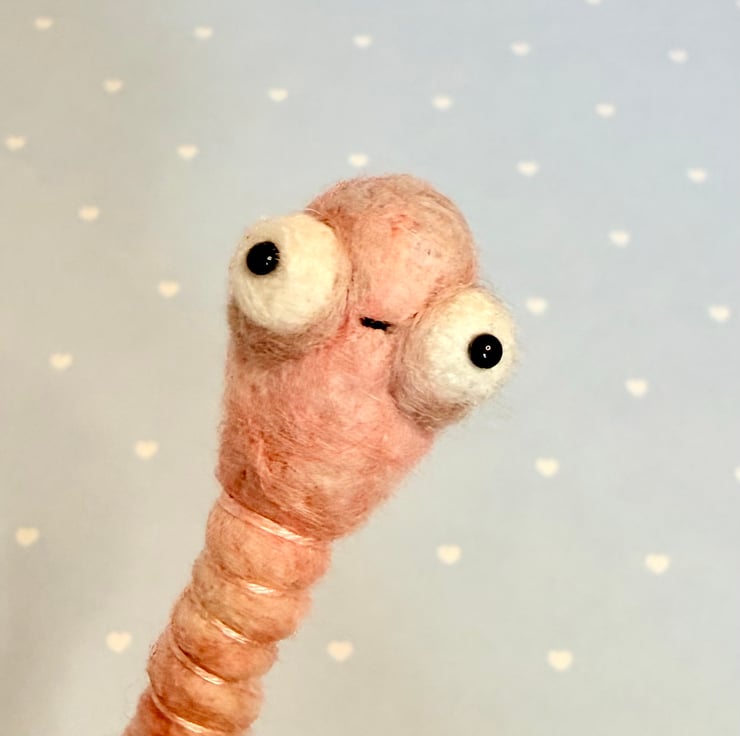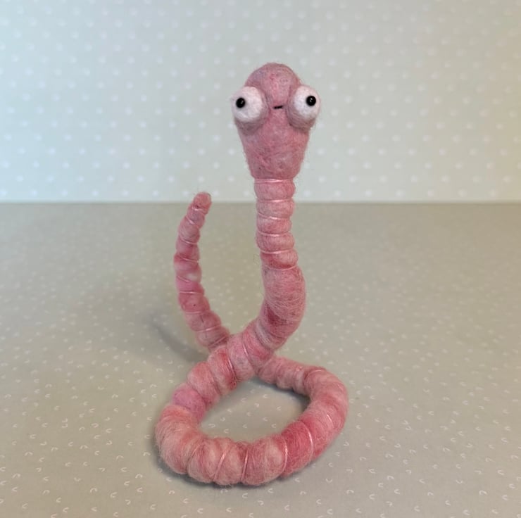 Decorative wired worm needlefelted with hand dyed wool. This worm has big eyes and eye bags with glass bead pupils and hand sewn mouth. The worm has pink thread around the body and can be gently twisted and posed into many positions. Worm measures roughly 26cm long.