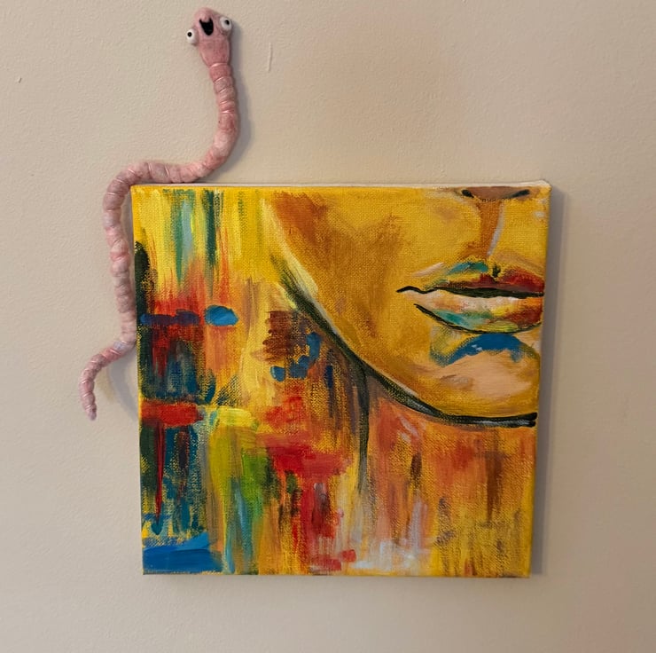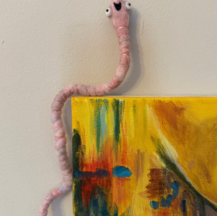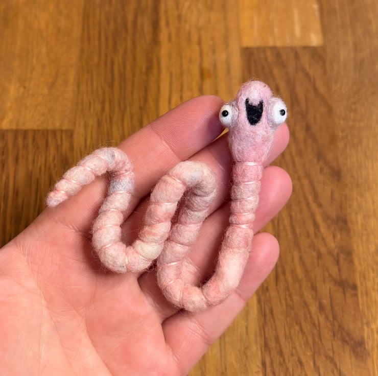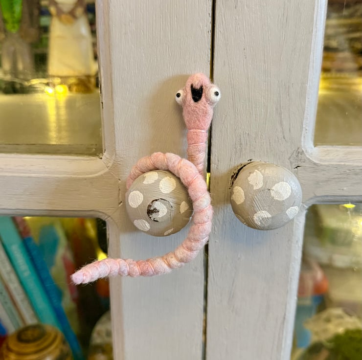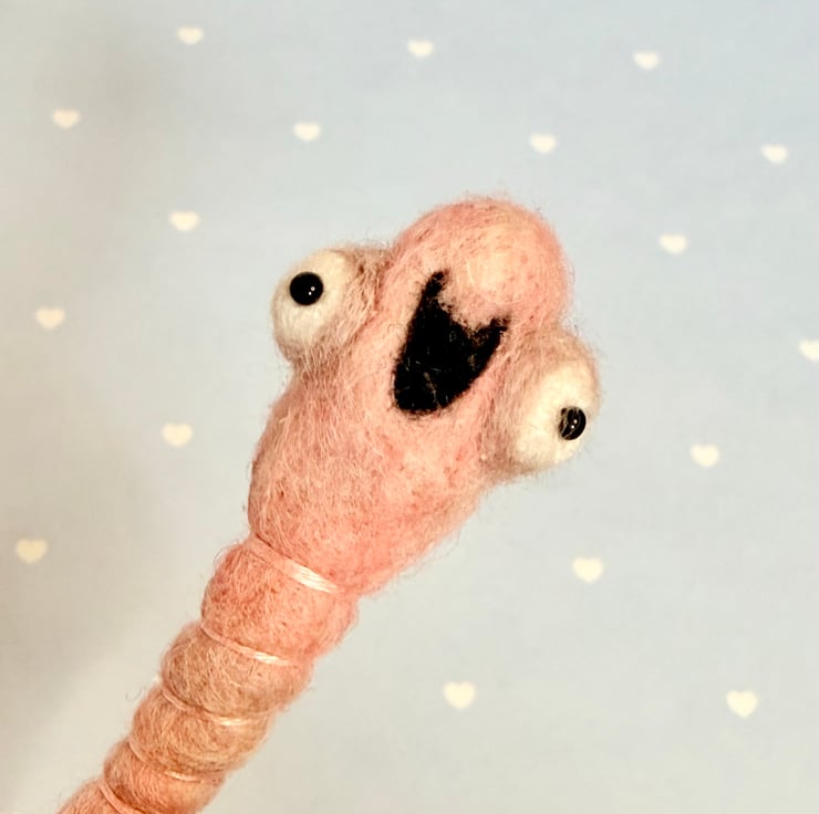 Decorative wired worm needlefelted with hand dyed wool. This worm has big eyes and eye bags with glass bead pupils and hand sewn mouth. The worm has pink thread around the body and can be gently twisted and posed into many positions. Worm measures roughly 26cm long.