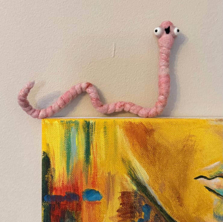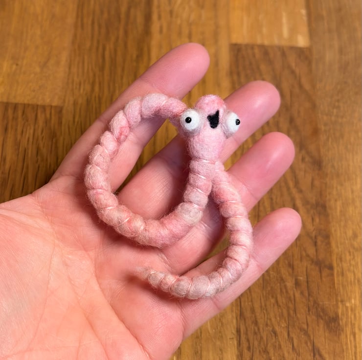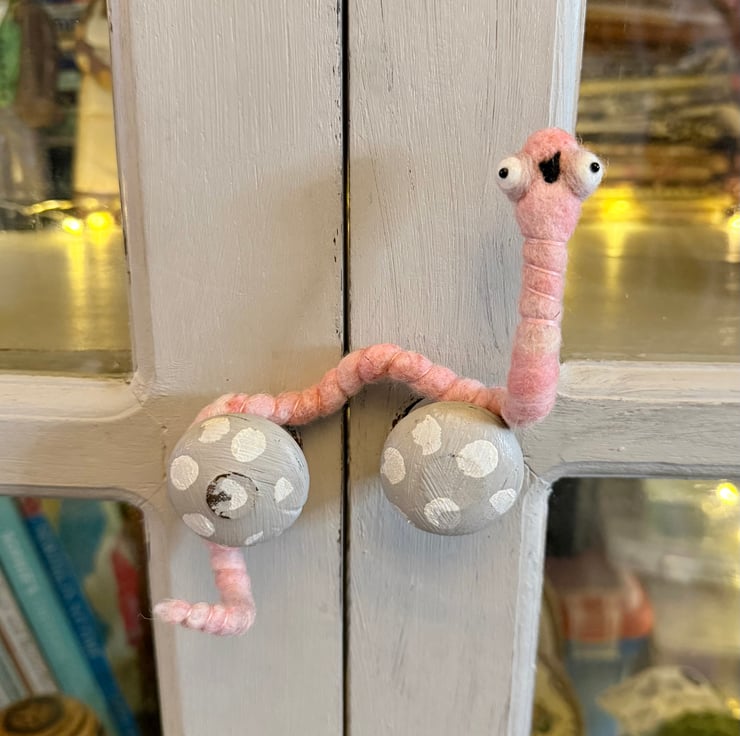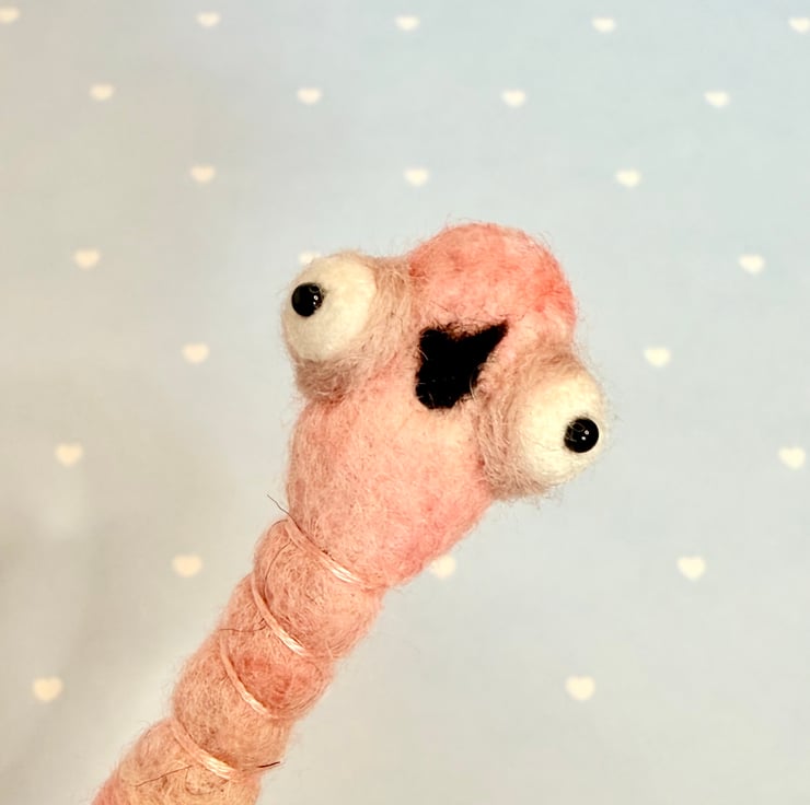 Decorative wired worm needlefelted with hand dyed wool. This worm has big eyes and eye bags with glass bead pupils and hand sewn mouth. The worm has pink thread around the body and can be gently twisted and posed into many positions. Worm measures roughly 25cm long.