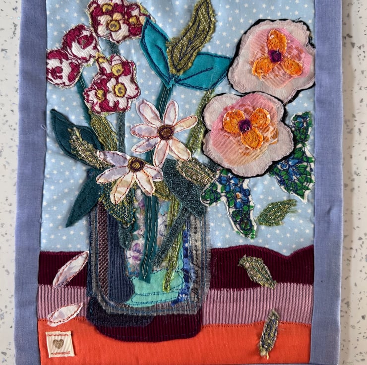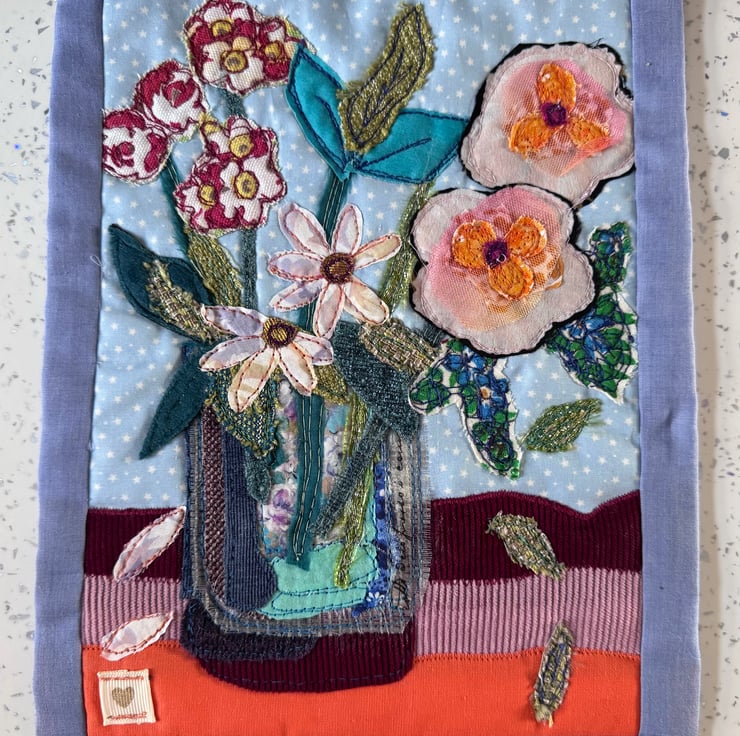 This one-of-a-kind piece features a stitched floral arrangement in a vase, built up with layered fabrics, textured scraps, and free-motion sewing techniques to create depth, movement, and a tactile, painterly feel.