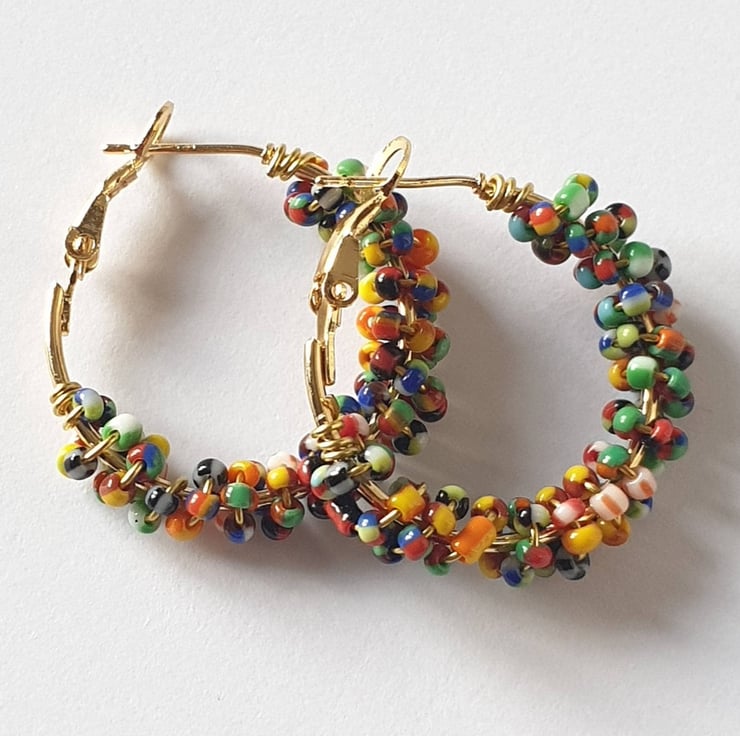 Make Your Own Seed Bead Hoop Earrings - gold hoops with multicoloured beads.