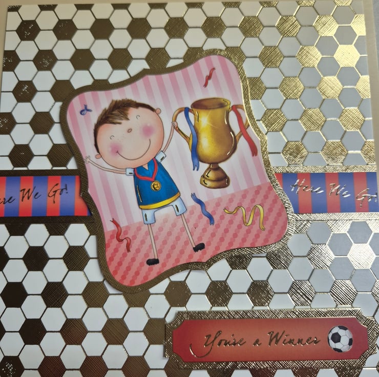 A birthday greetings card for a young football fan showing a topper with a cartoon footballer holding the winners cup. The greeting on the front is You're a Winner. The insert has the words Birthday Wishes.