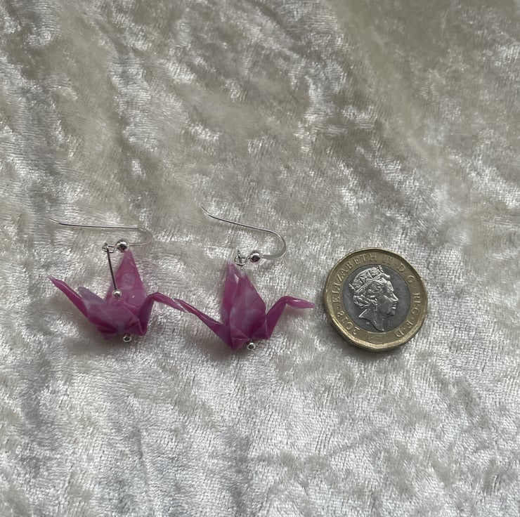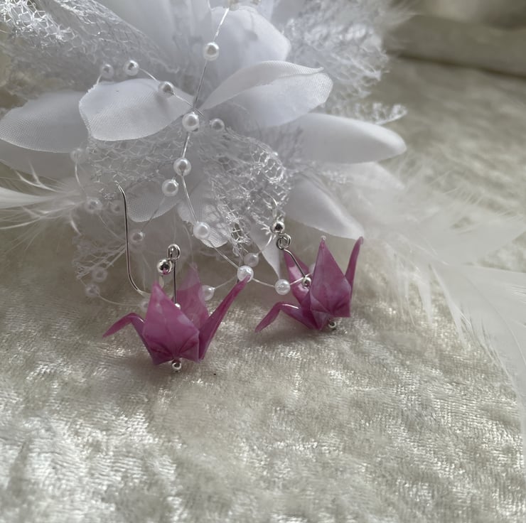 A Pair Of Earrings Origami Cranes Paper Earrings in pink.These Dangle/Drop Earrings feature a theme of Birds, specifically Cranes, made from coated paper. The earrings originate from England and are a romantic accessory in a lovely pink colour. The size of the cranes are about 3 cm. Made from a size of 1/16 of an original origami paper and coated with resin. Also used 925 sterling silver ear wire hocks.