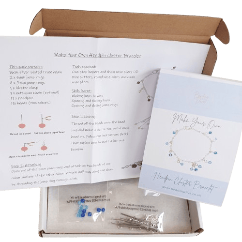Comes with a mix of glass blue beads, silver plated chain, stainless steel headpins, silver plated lobster clasp and jump ring.