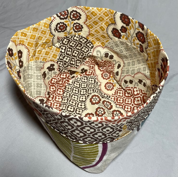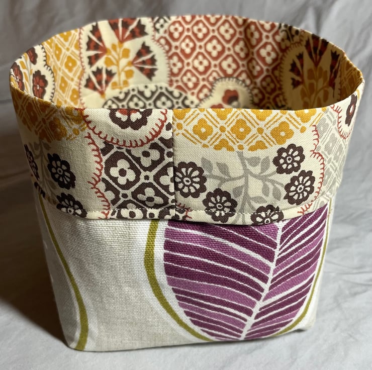 Handmade cotton fabric tub with contrasting lining, interfaced for extra strength and stability. You can fold the top over if you like that style, but because the lining extends over the outside, you don't have to - so you don't lose any storage capacity.